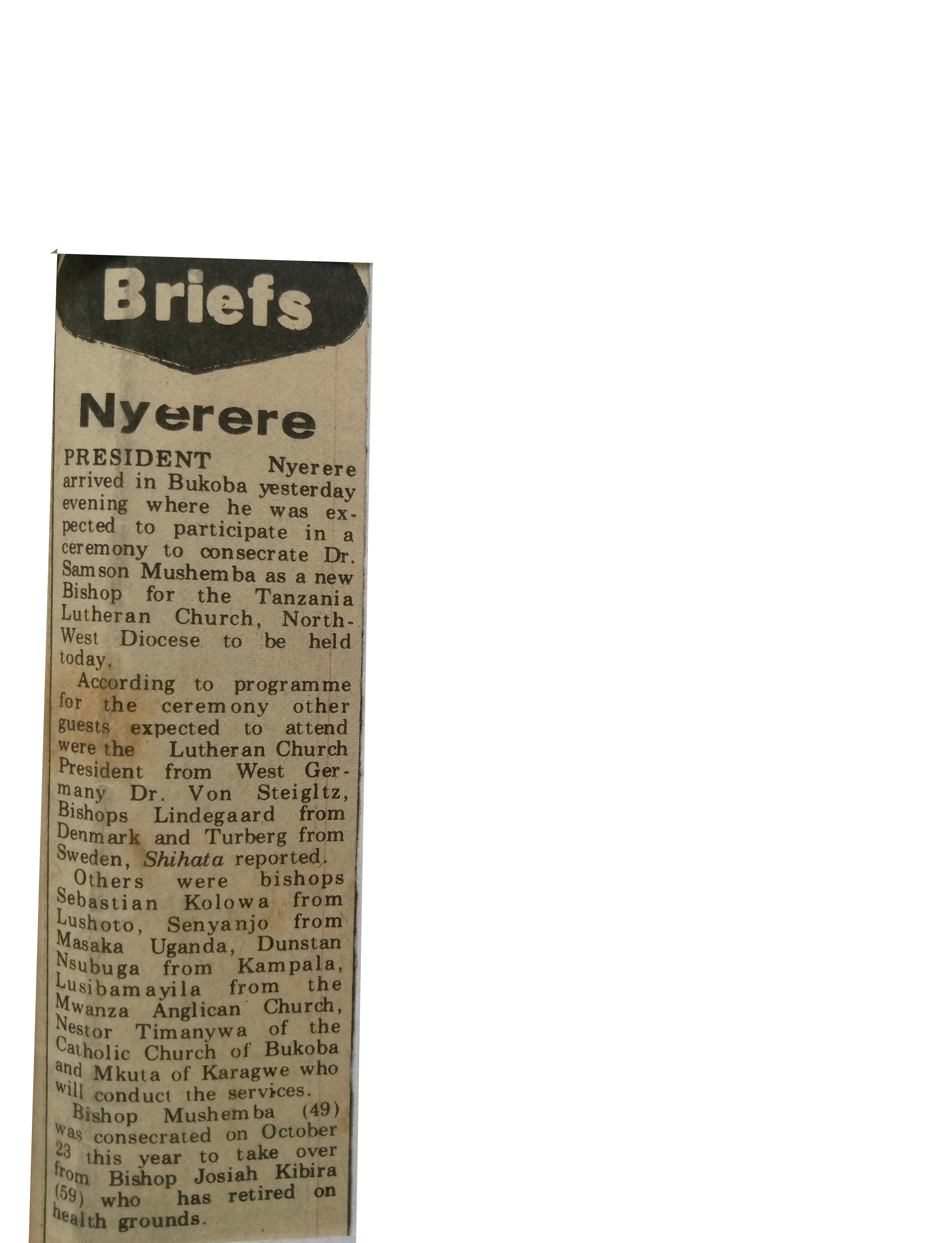 | dc.description.abstract | President Nyerere arrived in Bukoba yesterday evening where he was expected to participate in a ceremony to consecrate Dr Samson Mushemba as a new Bishop for the Tanzania Lutheran Church,North West Diocese to be held today. | en_US |