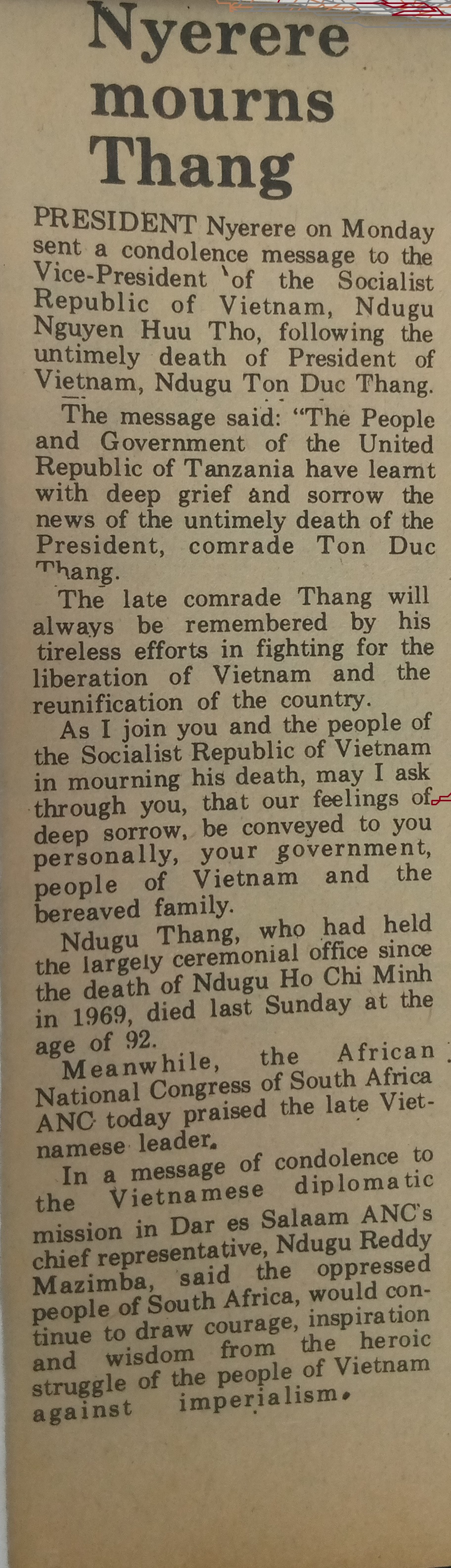 Nyerere mourns Thang(1980,April 2) Daily News ,pp.3