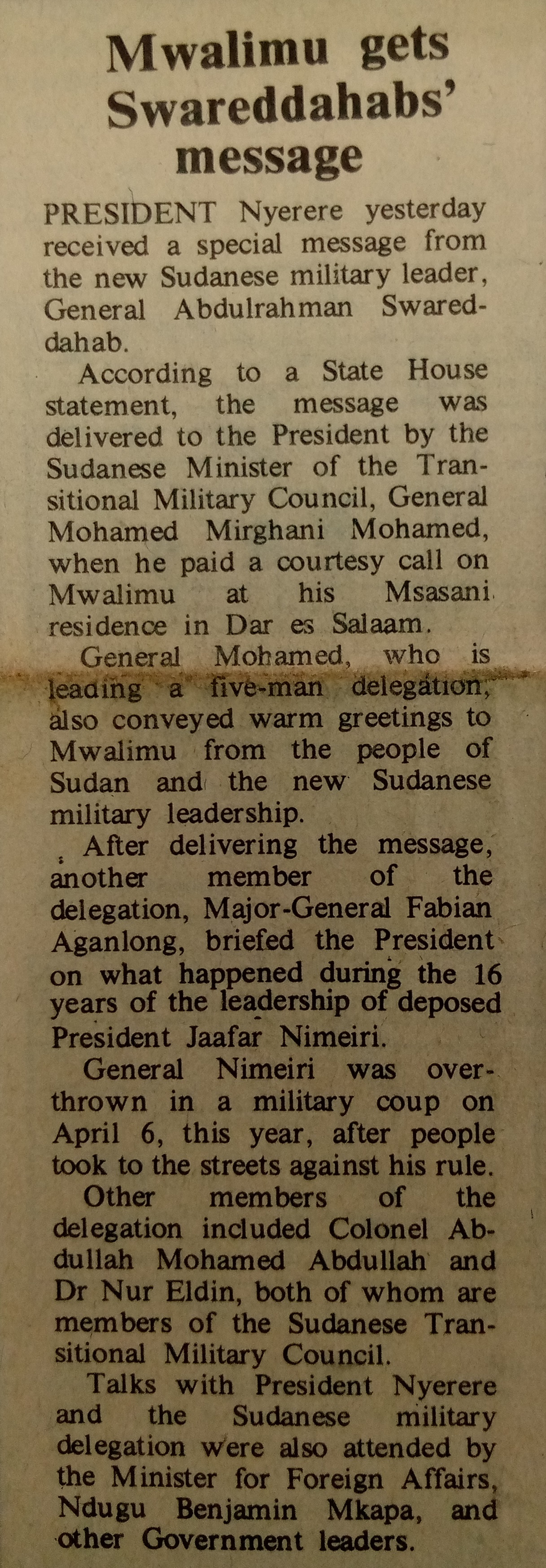 President Nyerere received a special message from the new Sudanese military leader, general Abdulrahman Swareddahab
