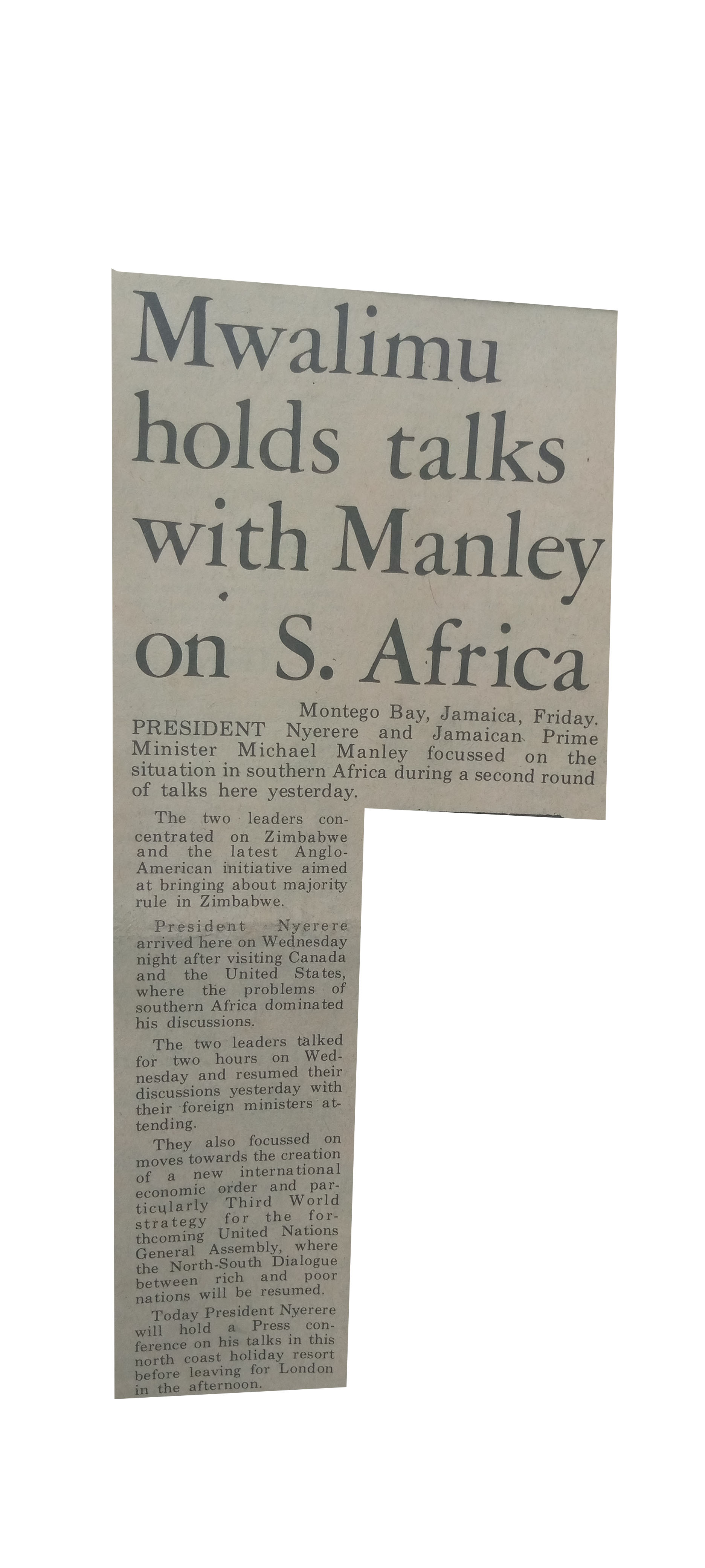 Mwalimu holds talks with Manley on S.Africa (1977,August 13) Daily News.pp.1