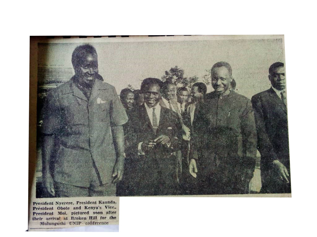 President Nyerere, President Kaunda, President Obote and Kenya's Vice president Moi pictured after arrival at Broken Hill