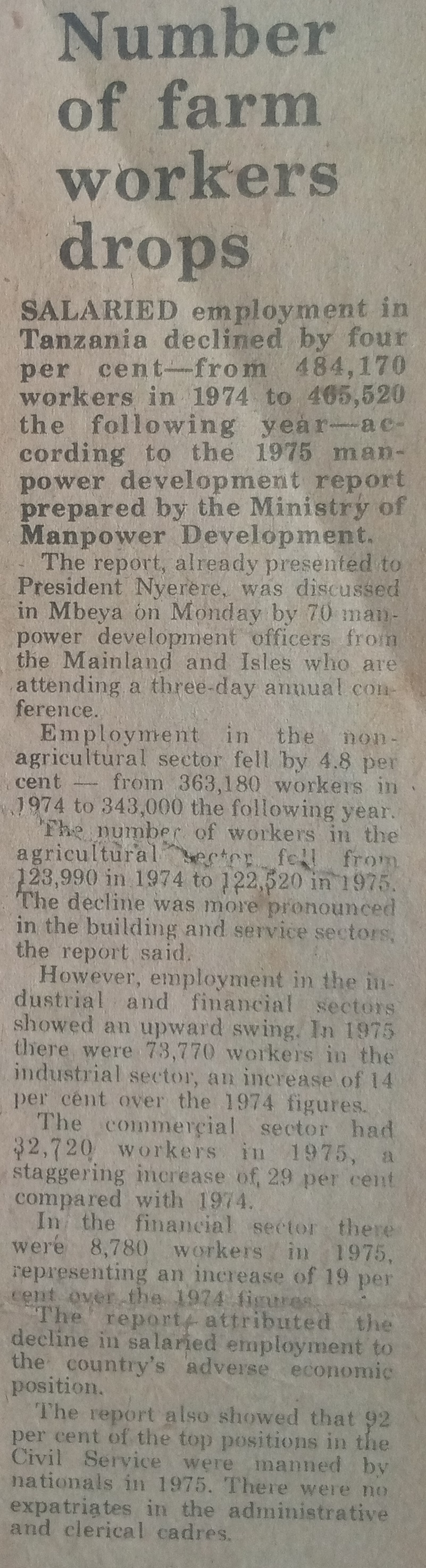 Salaried employment in Tanzania declined by four per cent-from 484,170 workers in 1974 to 465,520.