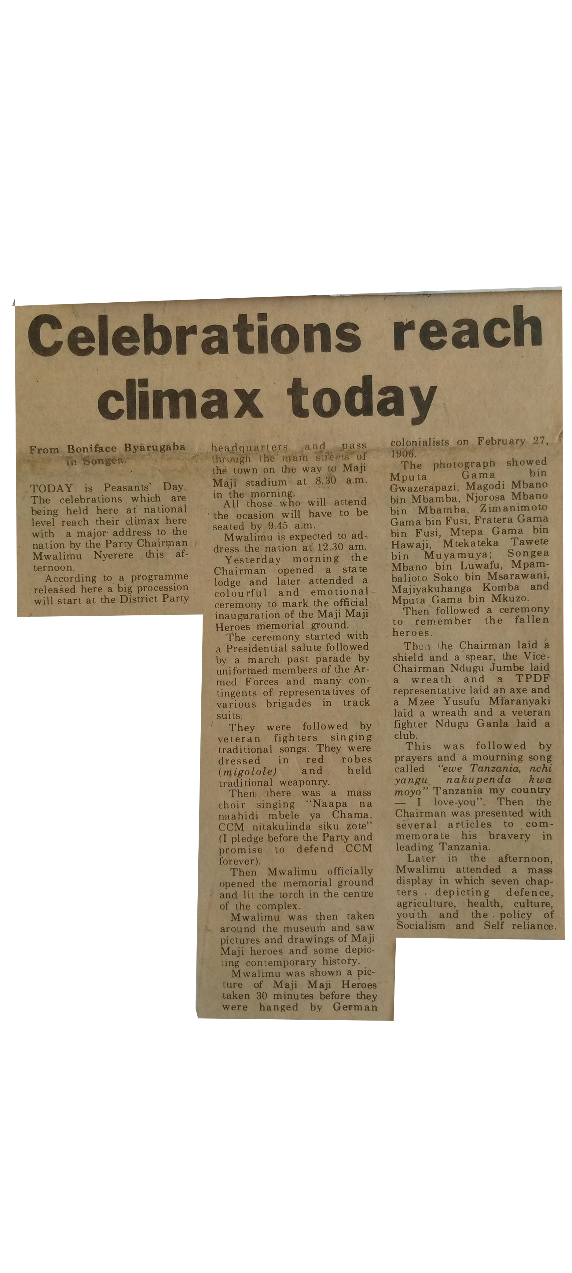 Today is Peasant Day.The celebrations which are being held here at national level reach their climax here with a major address to the nation by the Party Chairman Mwalimu Nyerere this afternoon.