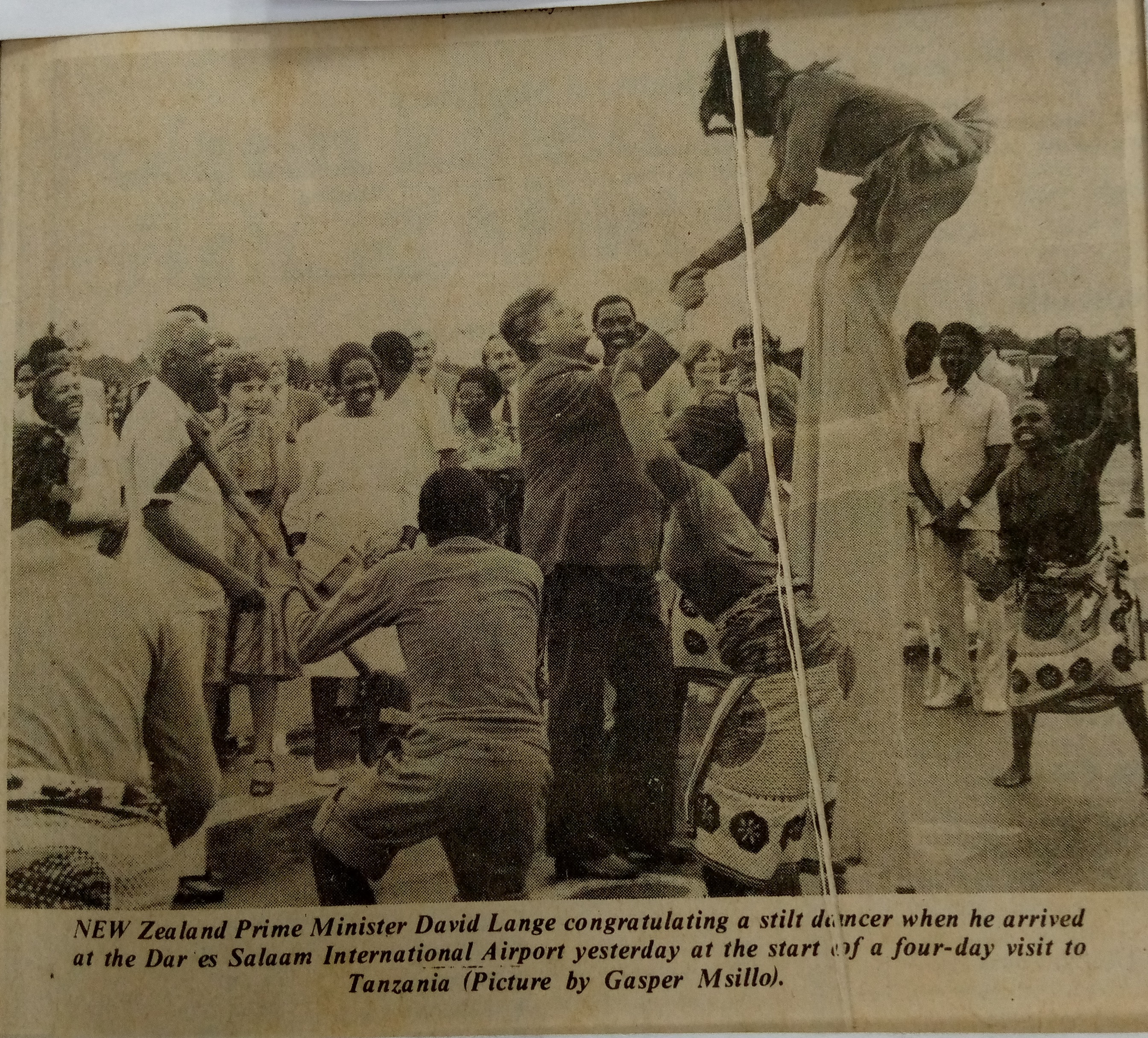 New Zealand Prime Minister David Lange congratulating a stilt dancer when he arrived at the Dar es Salaam International Airport