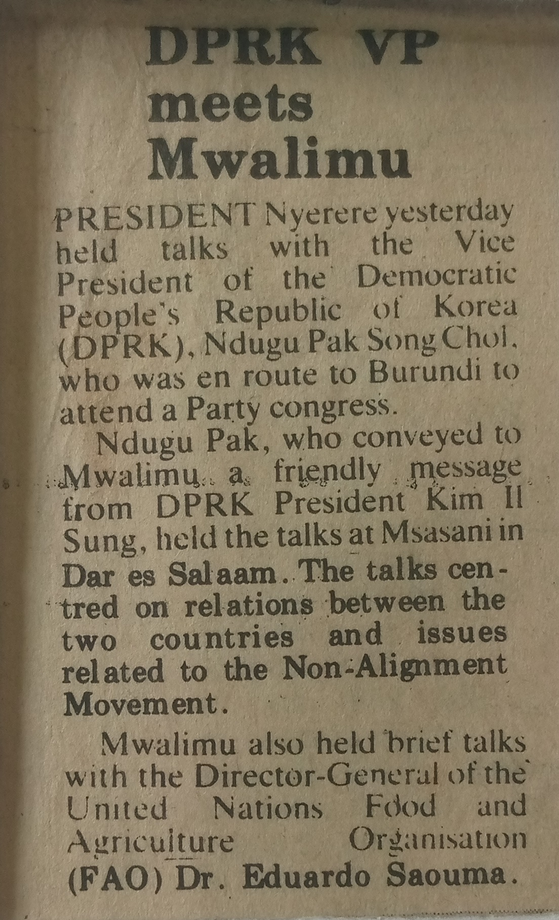 DPRK VP meets Mwalimu (1980,July 26) Daily News.pp.1