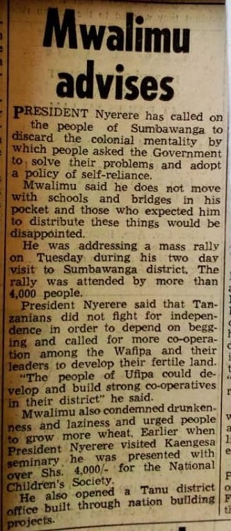 President Nyerere has called on the people of Sumbawanga to discard the colonial mentality by which people asked the government to solve their problems and adopt a policy fo self-reliance