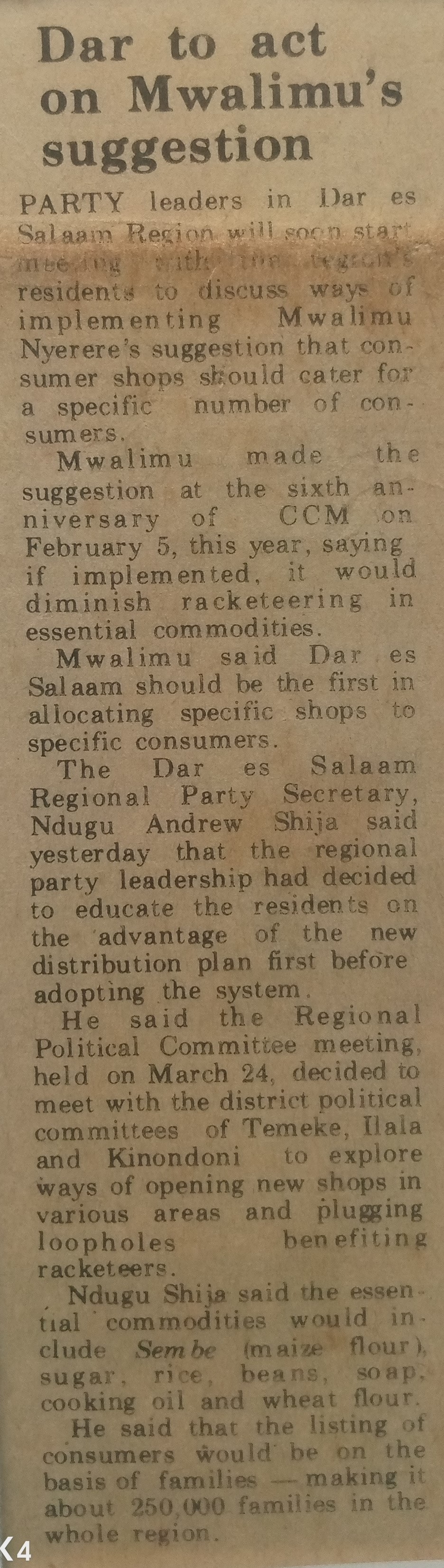 Dar to act on Mwalimu`s suggestion (1983,March 26) Daily News.pp.1