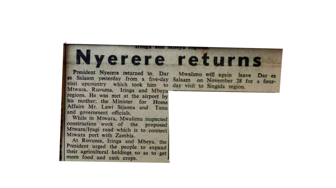 President Nyerere returned to Dar es salaam from five-day visit upcountry which took him to Mtwara, Ruvuma, Iringa and Mbeya region.