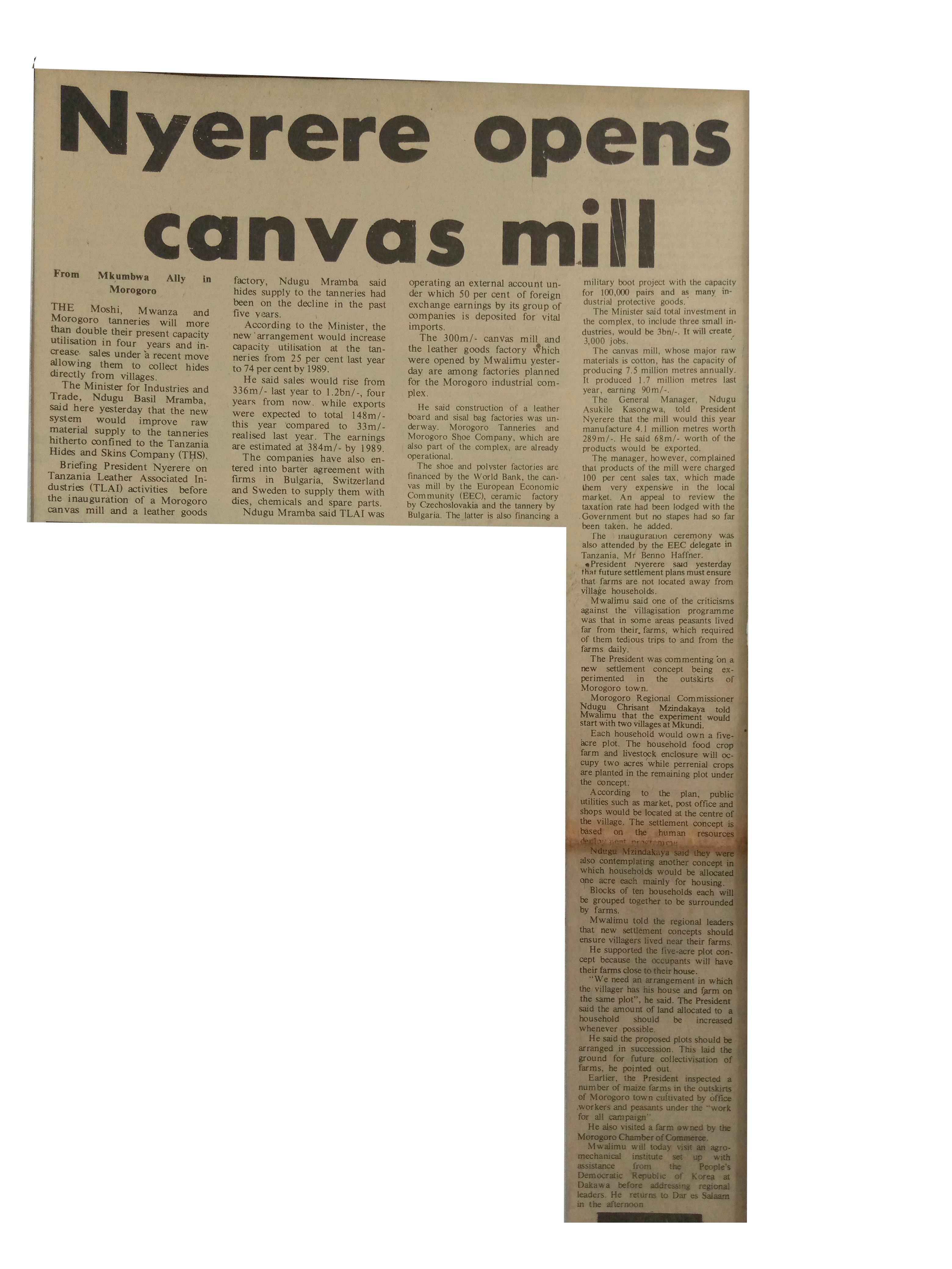 Nyerere opens canvas mill(1985,May 11).Daily News,pp.1