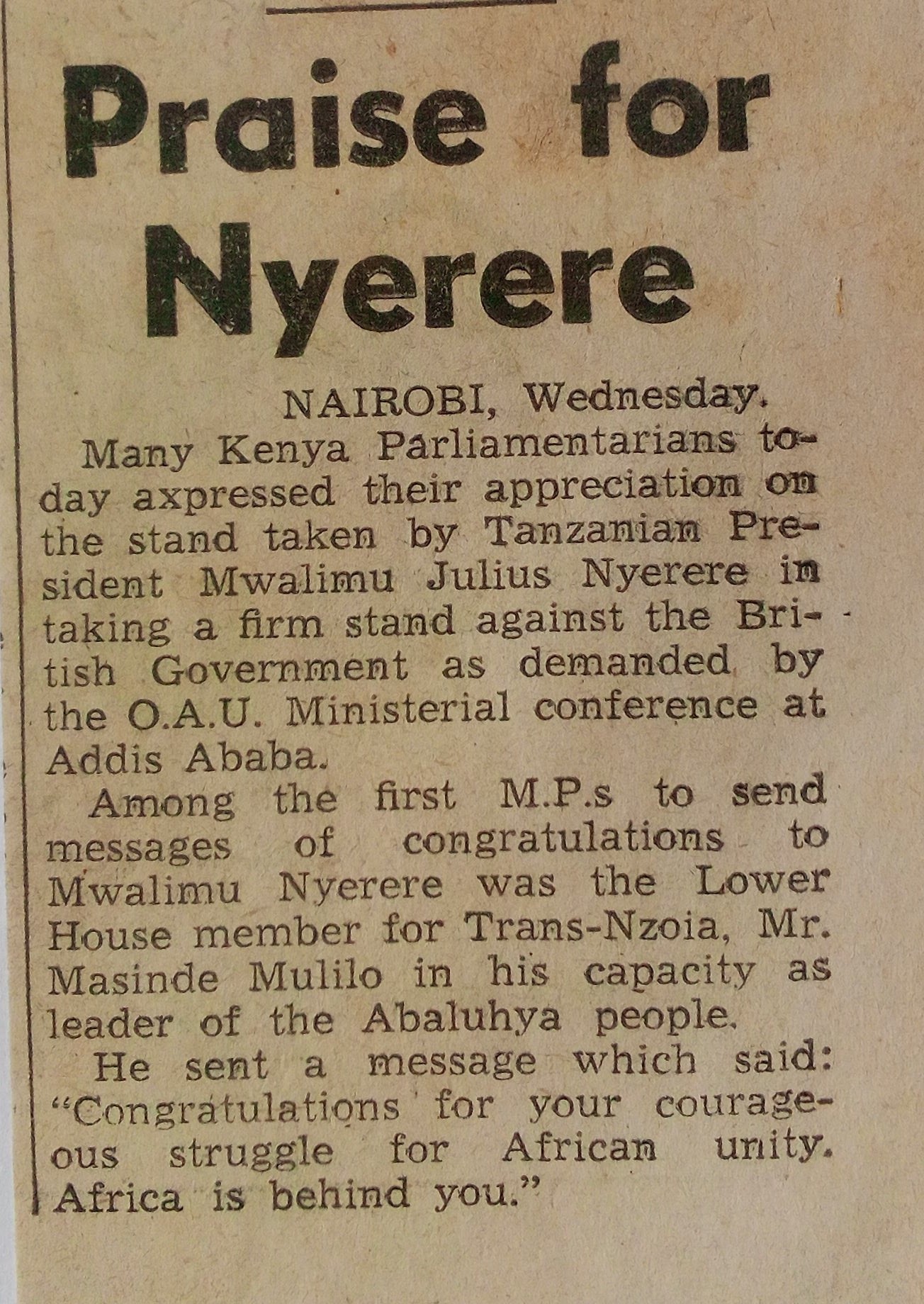 Many Kenya Parliamentarians today expressed their appreciation on the stand taken by Tanzania president Mwalimu Julius Nyerere in taking a firm stand against the British a Government as demanded by the O.A.U. Ministerial conference at Addis Ababa.
