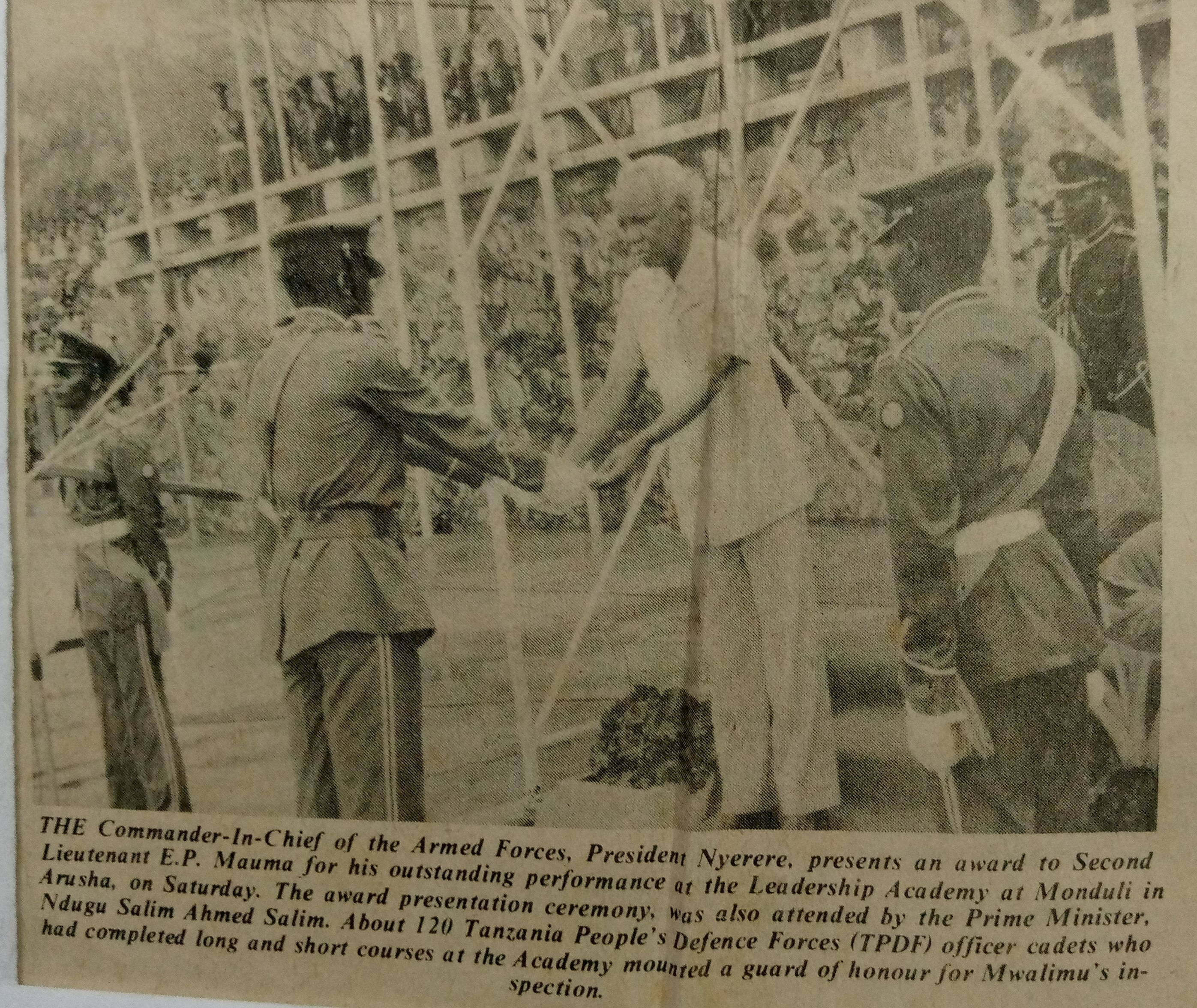 President Nyerere presents an award to second lieutenant E.P. Mauma