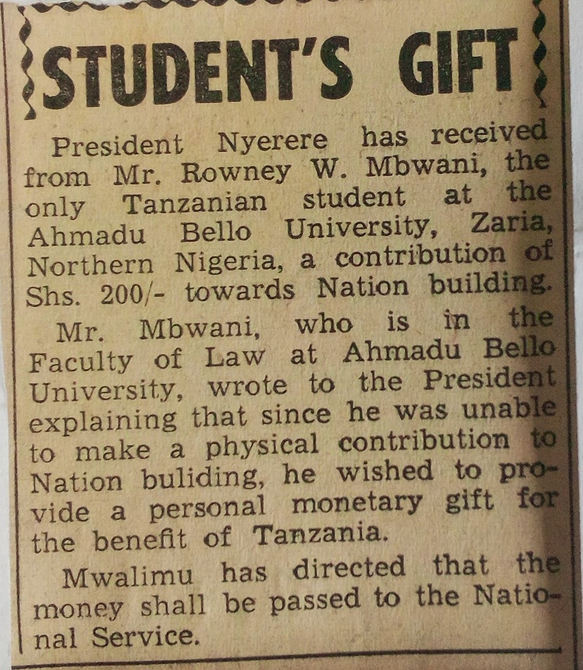 President Nyerere has received from Mr. Rowney W. Mbwani, the only Tanzania student at the Ahmadu Bello University, Zaria, Northern Nigeria, a contribution of shs. 200/- towards Nation building