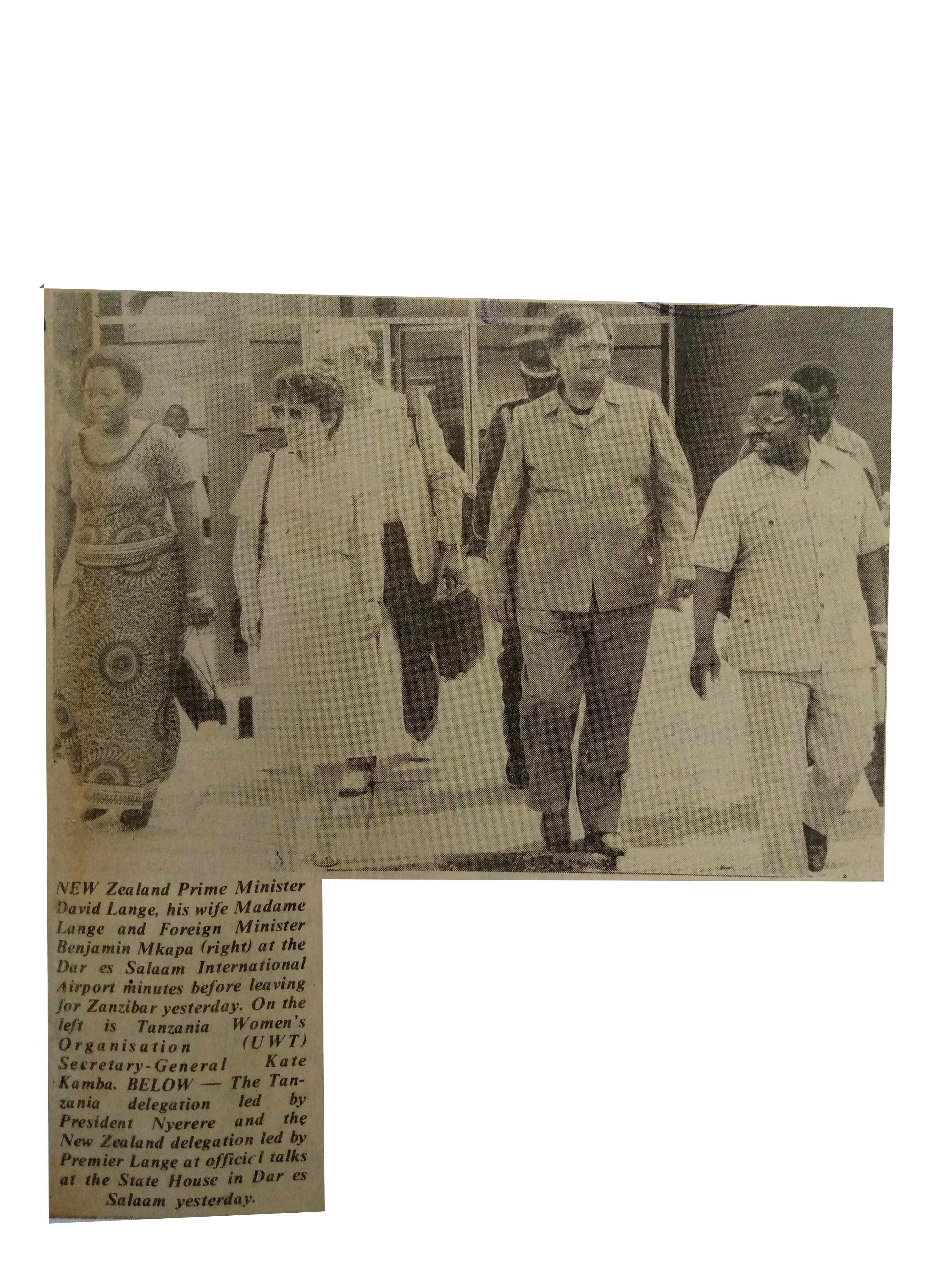 New Zealand Prime Minister David Lange,his wife Madame Lange and Foreign Minister Benjamin Mkapa at the Dar es Salaam International Airport