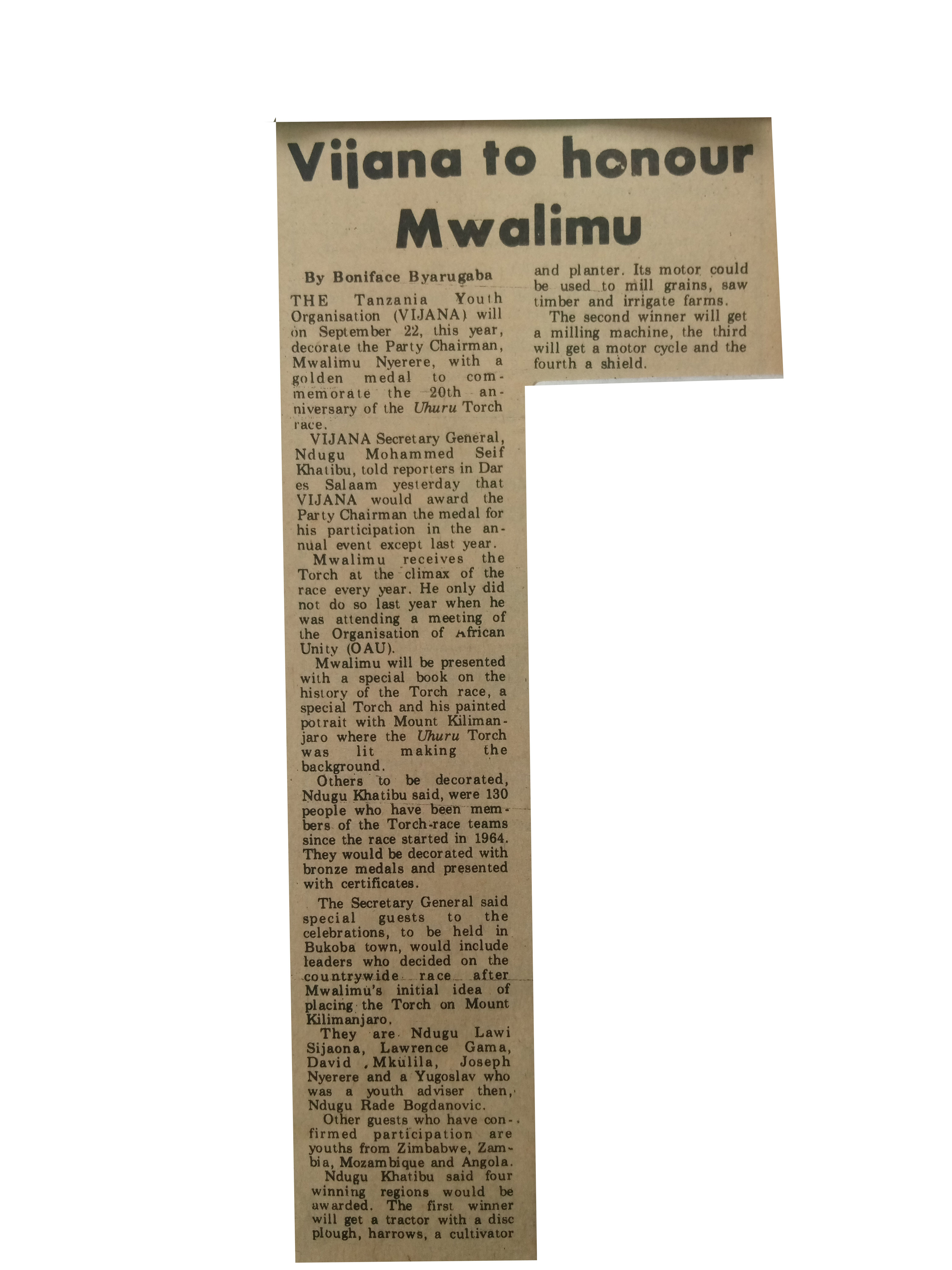 Vijana to honour Mwalimu (1984,September 15) Daily News.pp.1