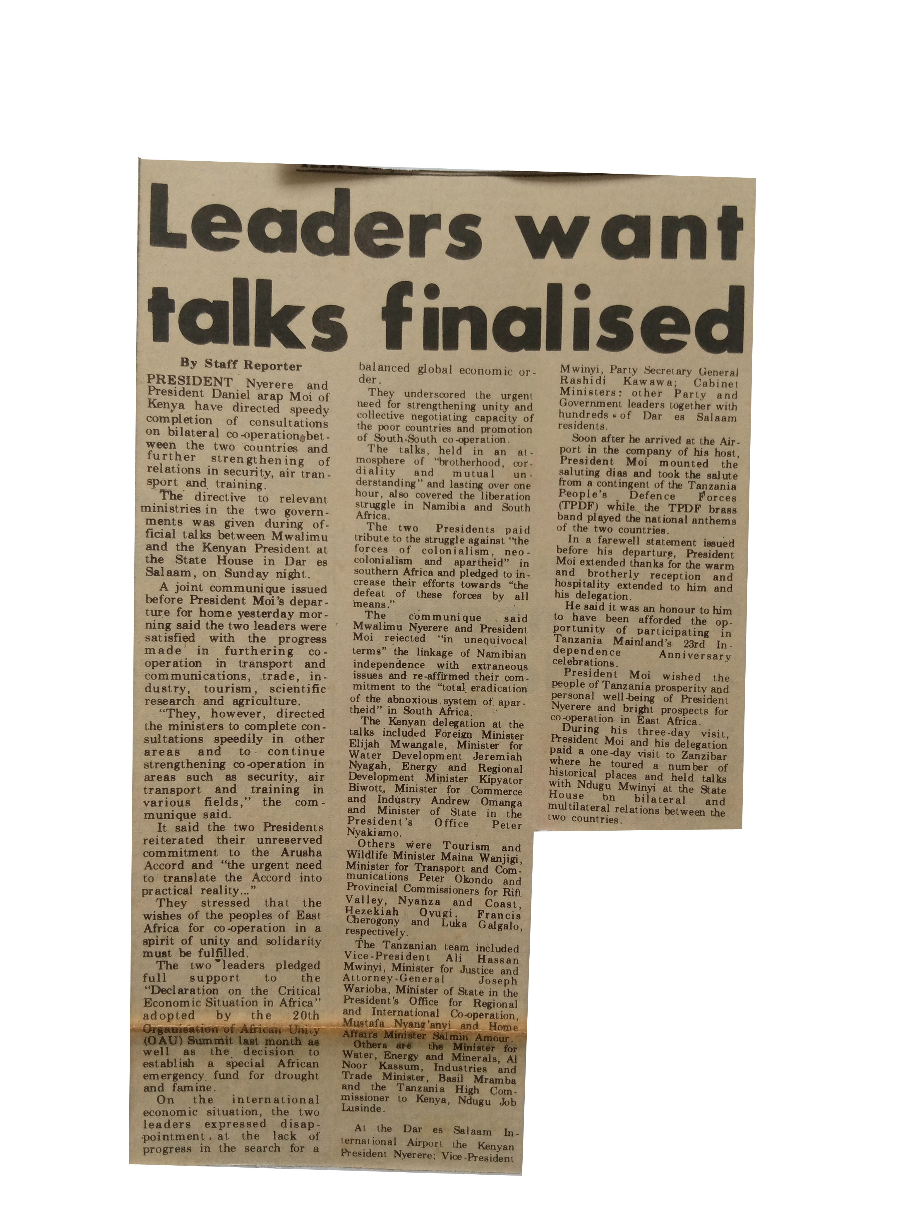 President Nyerere and President Daniel arap Moi of kenya have directed speedy completion of consultations on bilateral co-operation between the two countries and further strengthening of relations in security,air transport and training.