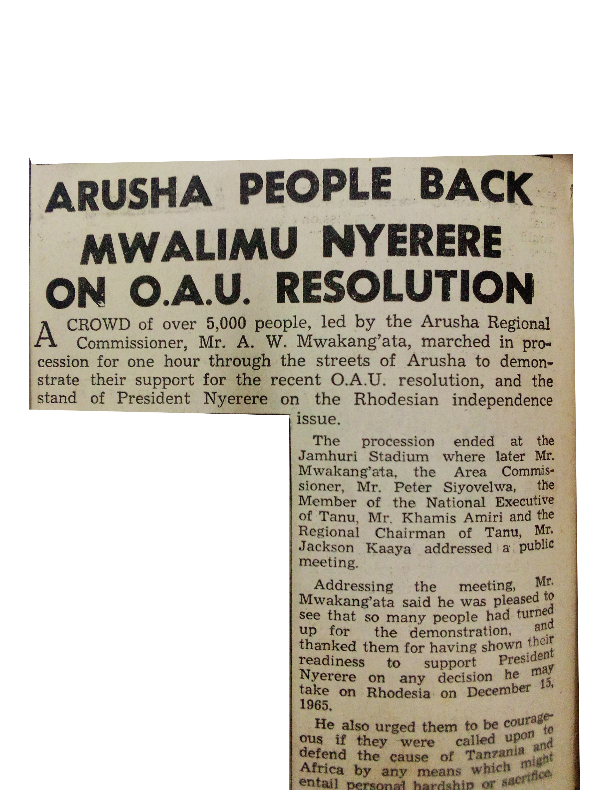 Arusha people back Mwalimu Nyerere on O.A.U resolution(1965, December 13), The Nationalist.pp.2