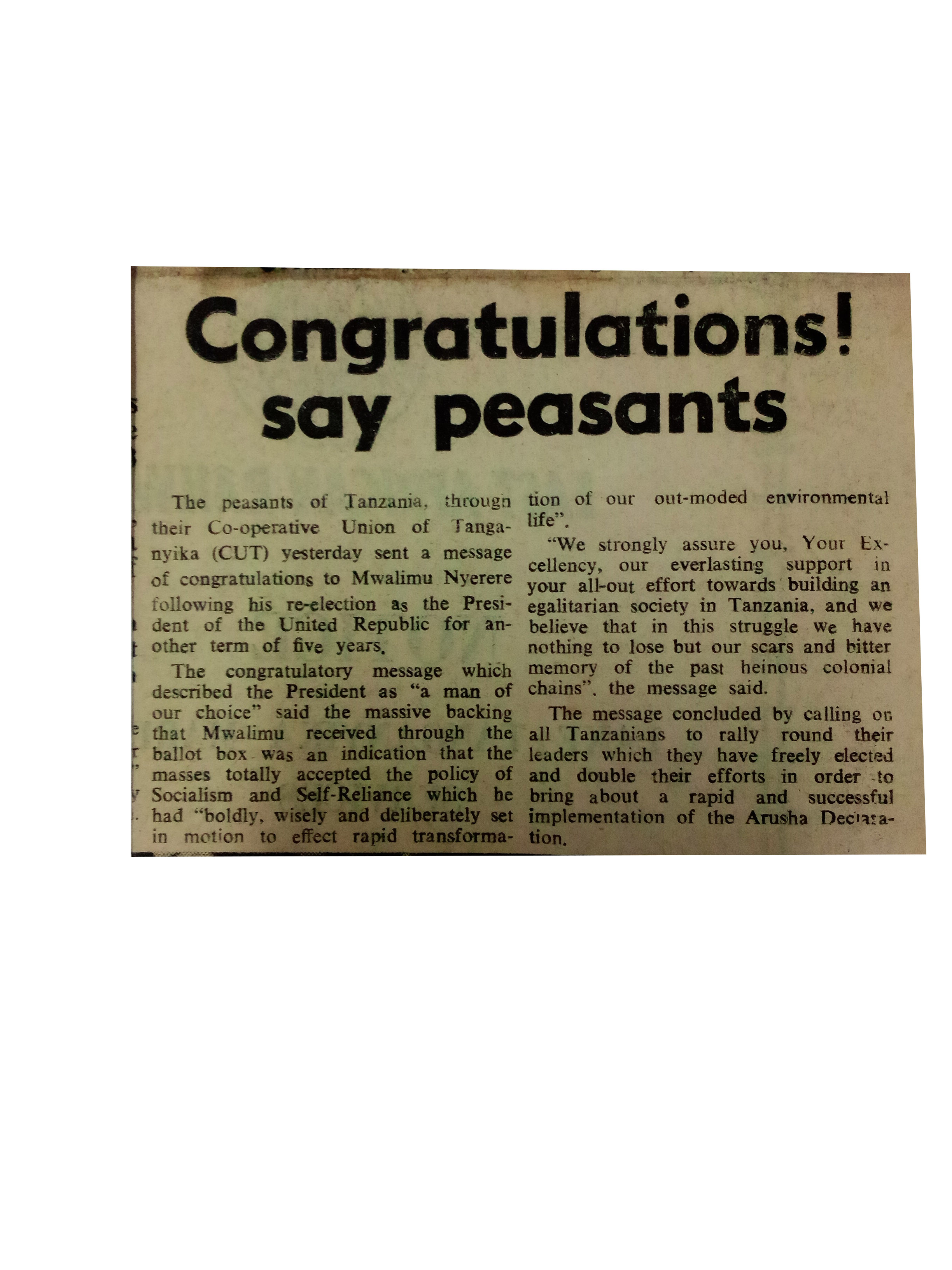 | dc.description.abstract | The peasants of Tanzania,through their Co-operative Union of Tanganyika(CUT) yesterday sent a message of congratulations to Mwalimu Nyerere following his re-election as the President of the United Republic for an other term of five years. | en_US |