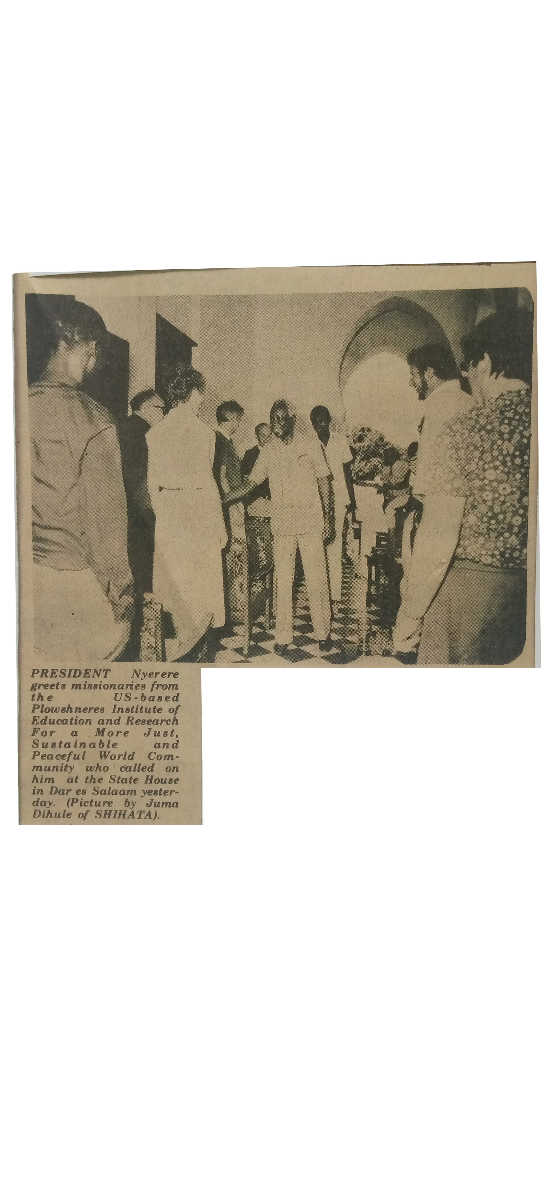 | dc.description.abstract | President Nyerere greets missionaries from the Us-based Plowshneres Institute of Education and Research For a More Just,Sustainable and Peaceful World Community who called on him at the State House in Dar es Salaam. | en_US |