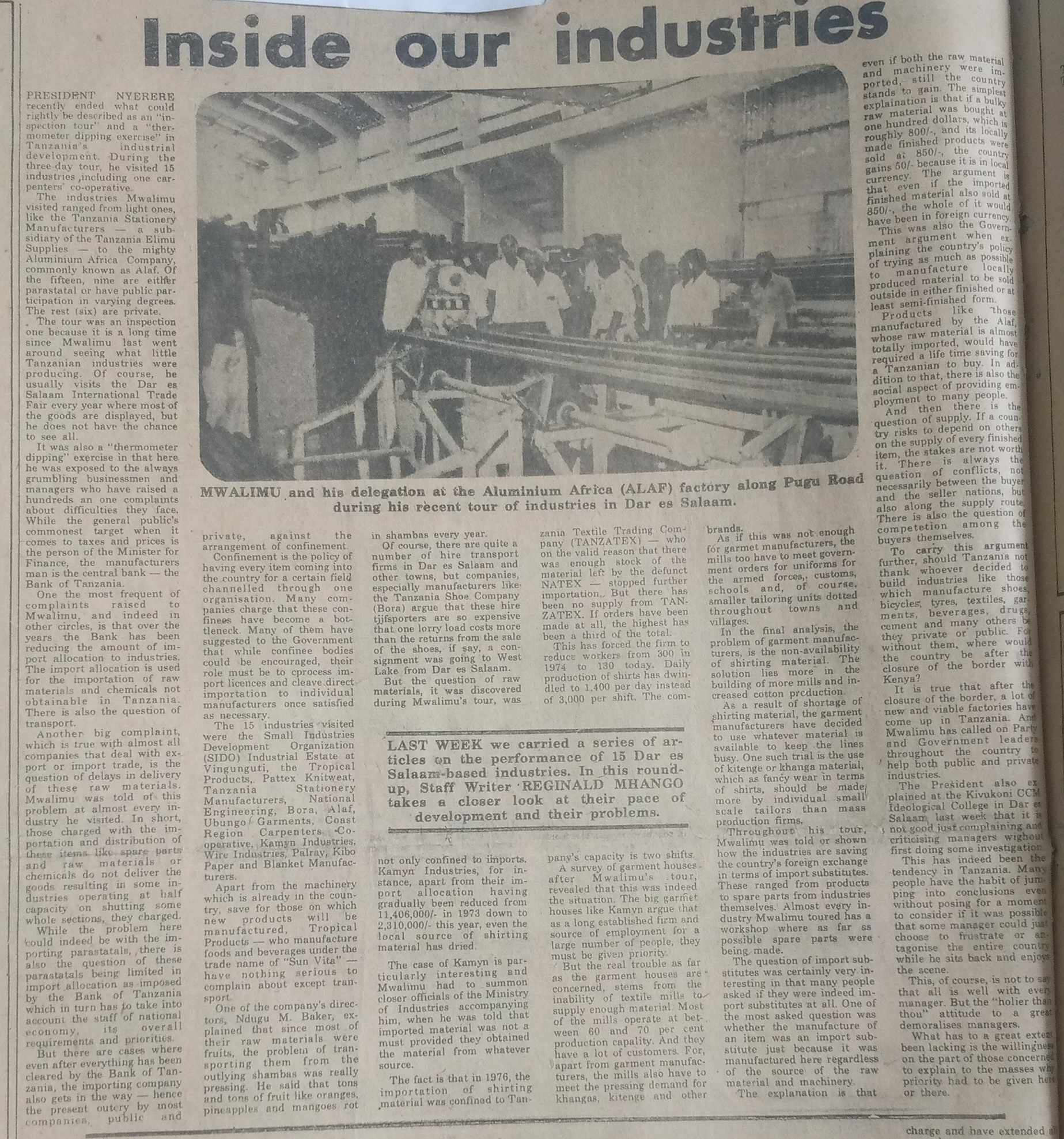 President nyerere recently be described as an in apection tour and a ther momenter dipping exercise in tanzania's industrial development.