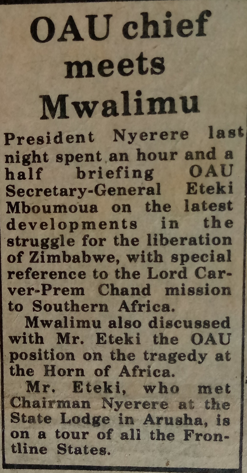 OAU chief meets Mwalimu (1977,Novembar 16) Daily News,pp1