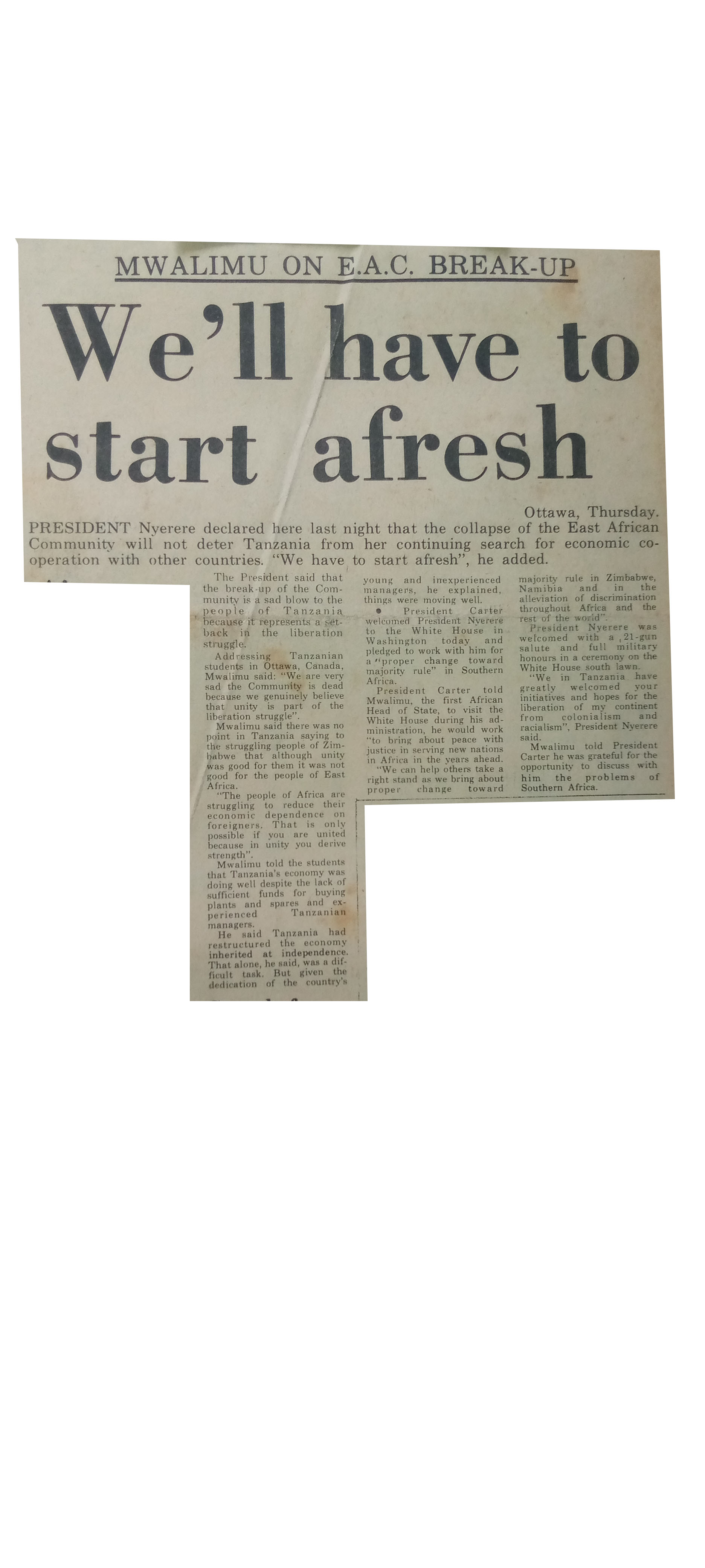 President Nyerere declared here last night that the collapse of the East African Community will not deter Tanzania from her continuing search for economic cooperation with other countries."We have to start afresh",he added.