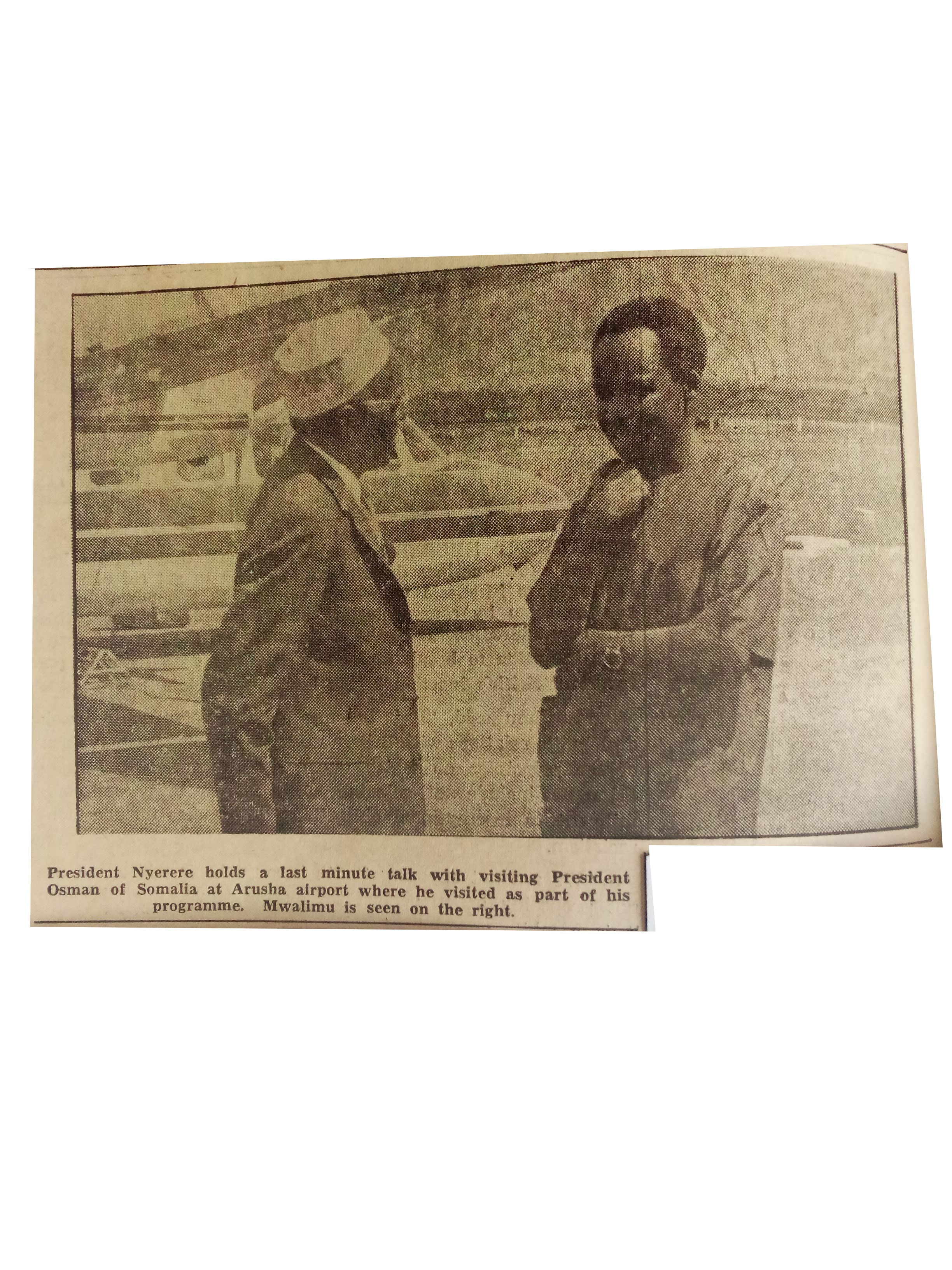 Nyerere, J.K (1967, Augaust 12) . President Nyerere last minute talk with President Osmon of Somalia at Arusha Airport. The Nationalist, pp, 1.