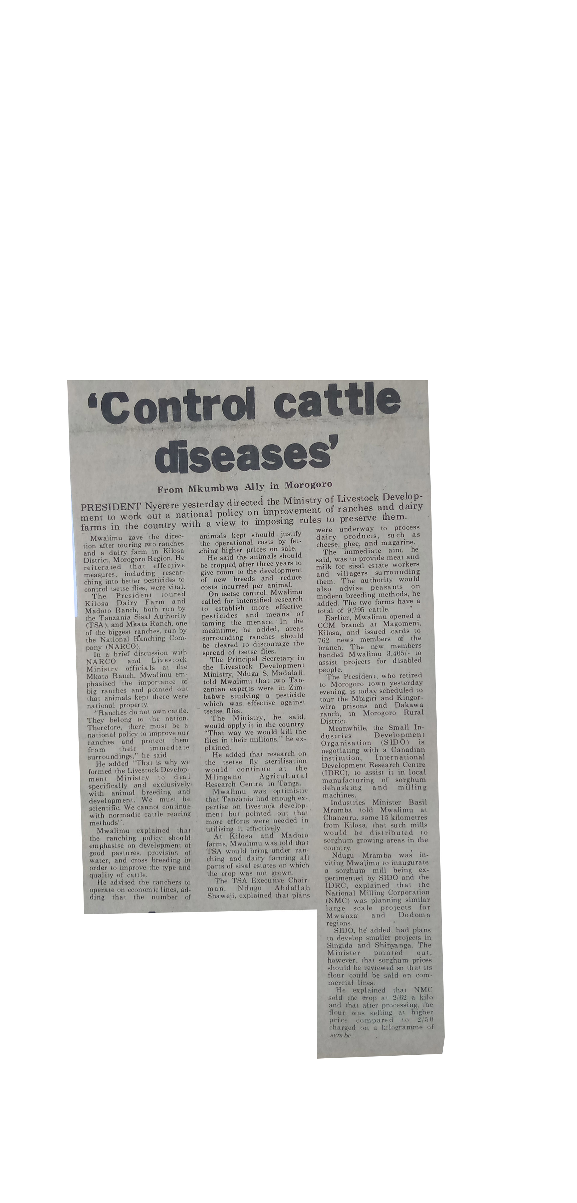dc.description.abstract | President Nyerere yesterday directed the Ministry of Livestock Development to work out a national policy on improvement of ranches and dairy farms in the country with view to imposing rules to preserve them. | en_US |