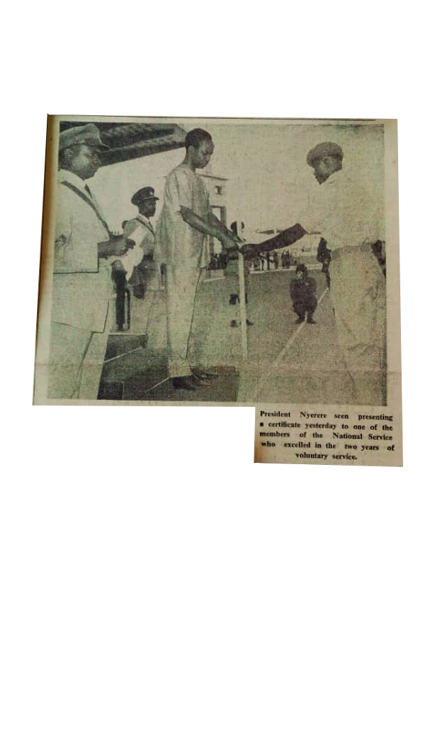 President Nyerere seen presenting a certificate to one of the members of the National service who excelled in the two years of voluntary service.