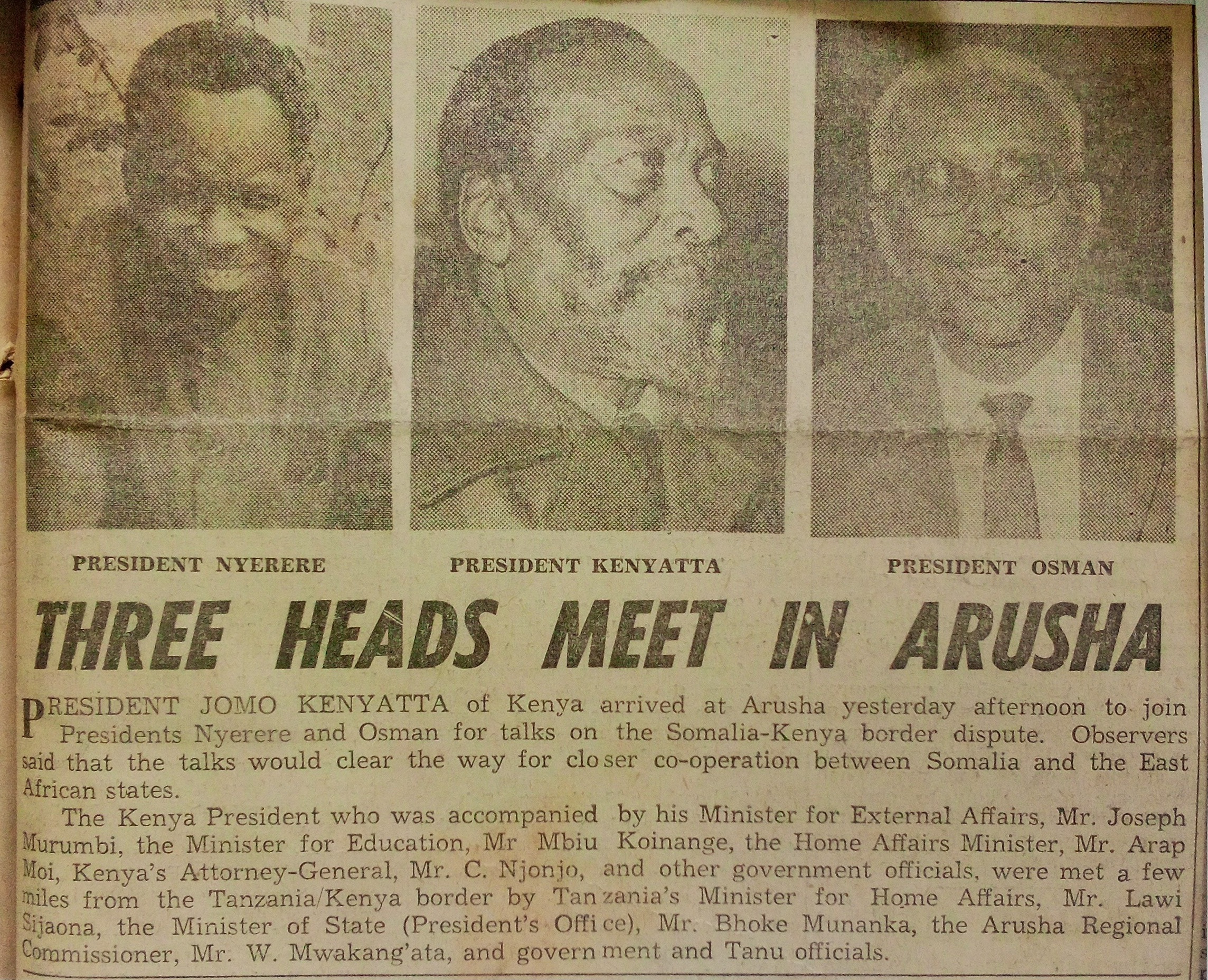 | dc.description.abstract | President Jomo Kenyatta of Kenya arrived at Arusha to join President Nyerere and Osman for talks on the Somalia-Kenya border dispute | en_US |
