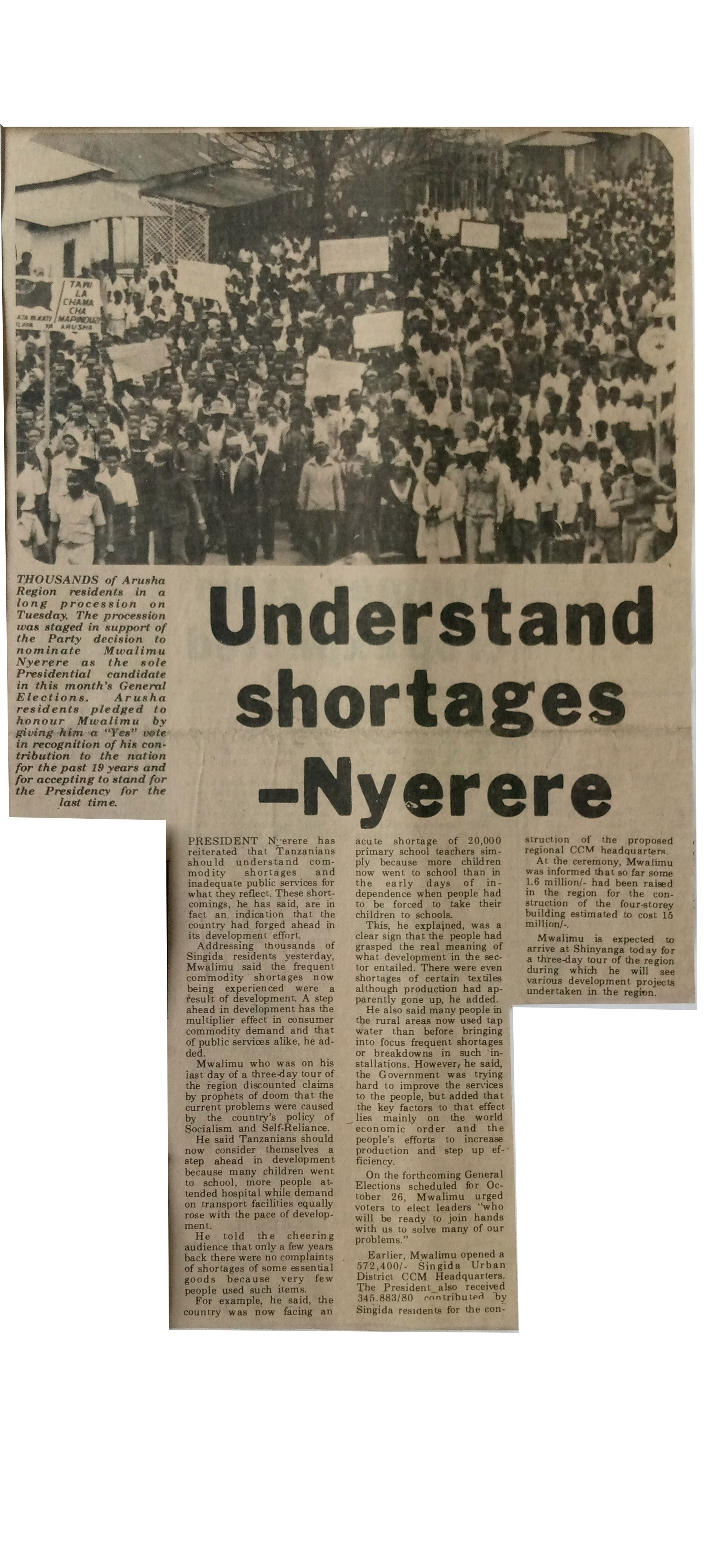 | dc.description.abstract | Thousands of Arusha region residents in a long procession on Tuesday. the Procession was staged in support of the party decision to nominate Mwalimu Nyerere as the sole presidential candidate in this general election | en_US |