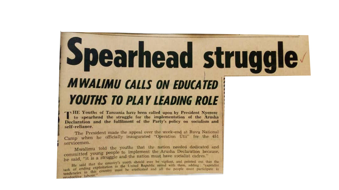 The youth of Tanzania have been called upon by president Nyerere to spearhead the struggle for the implementation of the Arusha declaration and the fulfillment of the party's policy on socialism and self-reliance
