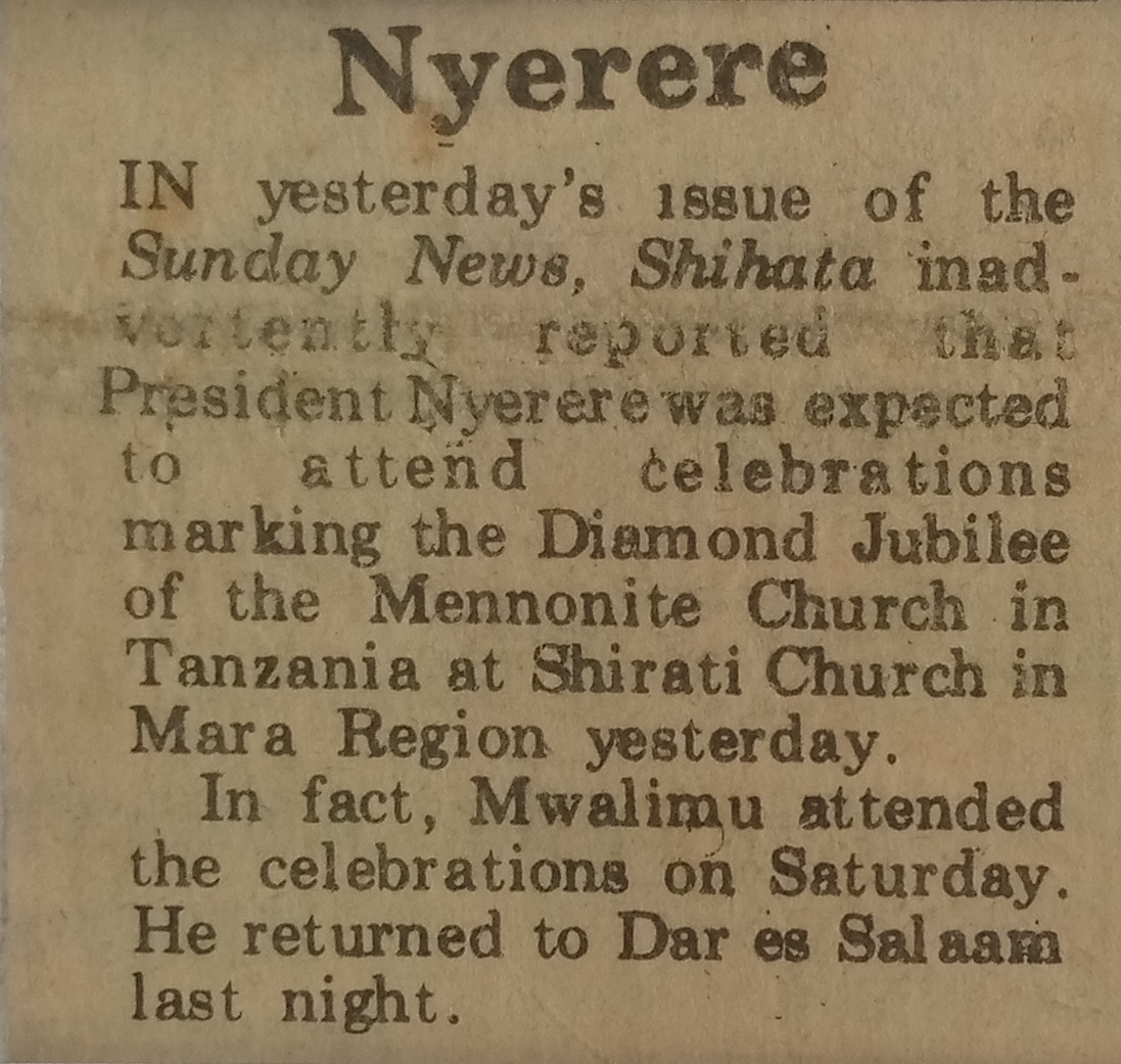 In yesterday's issue of sunday News,Shihata inadvertently reported that President Nyerere was expected to attend celebrations marking the Diamond Jubilee of the Mennonite Church in Tanzania at Shirati Church in Mara Region yesterday.