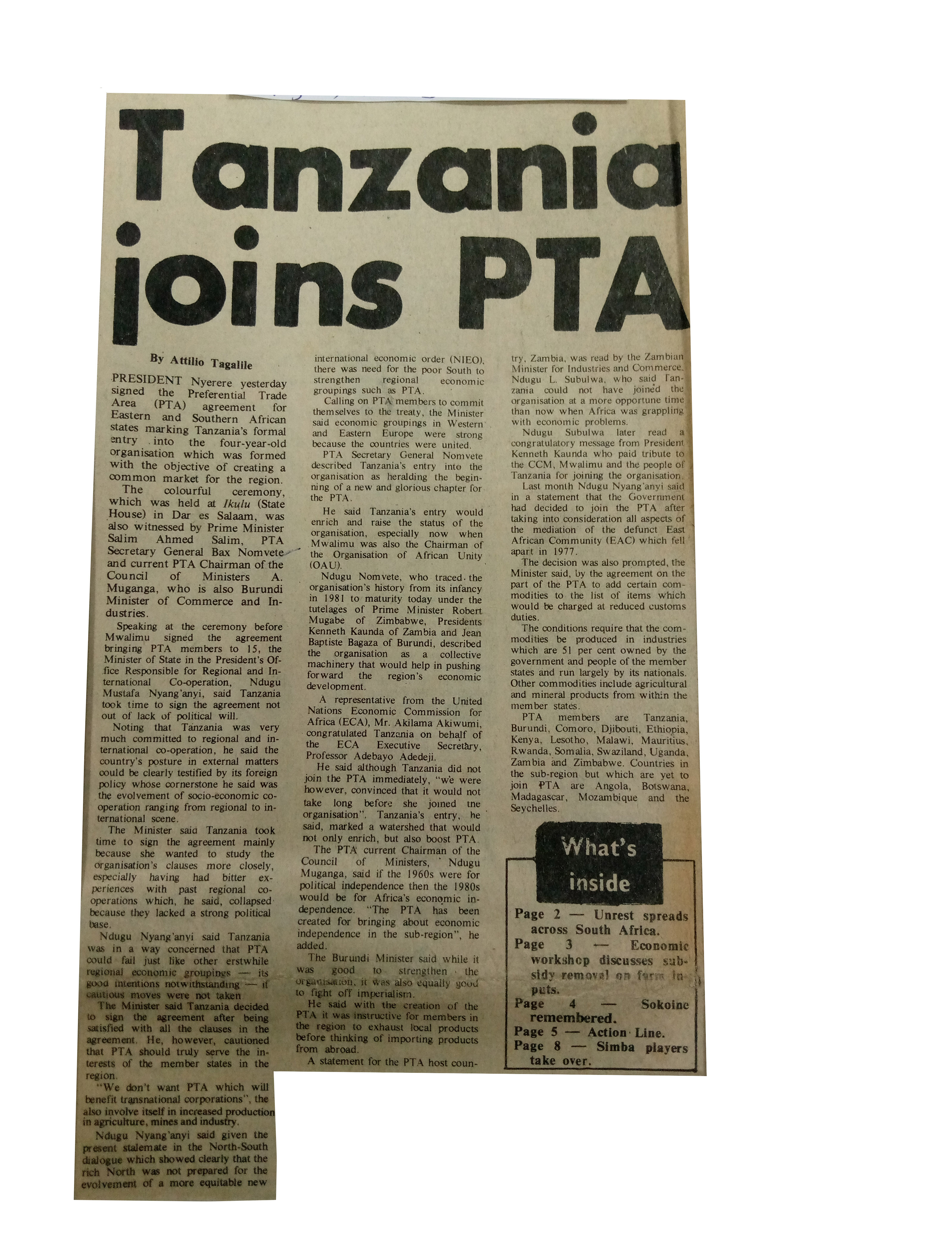 Tanzania joins PTA (1985, April 12). Daily News, pp.1