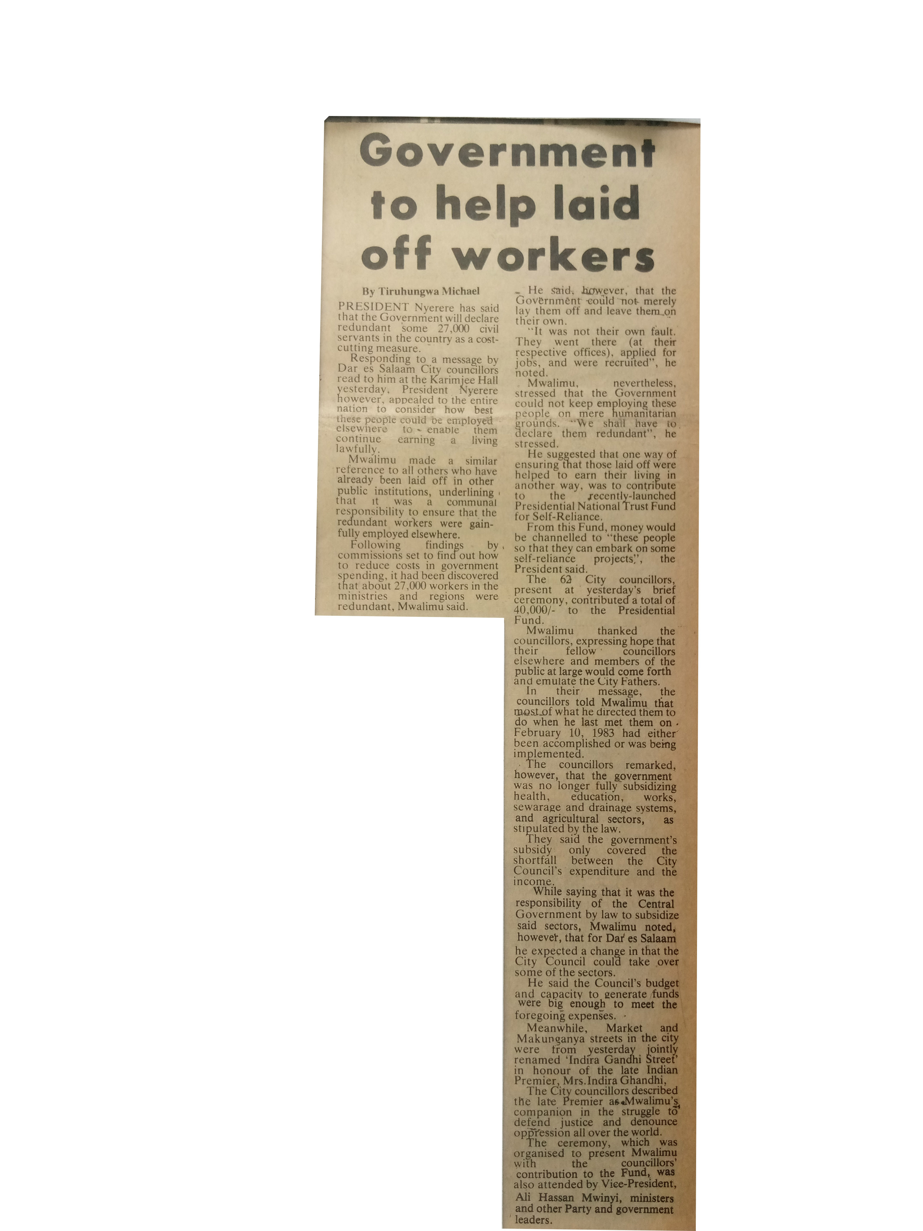 President Nyerere has said that the government will declare redundant some 27000 civil servants in the country as a cost cutting measure. Responding to a message by Dar es Salaam City Councillors read to him at the Karimjee Hall yesterday,President Nyerere however,app-lead to the entire nation to consider how best these people could be employed elsewhere to enable them continue earning a living lawfully.