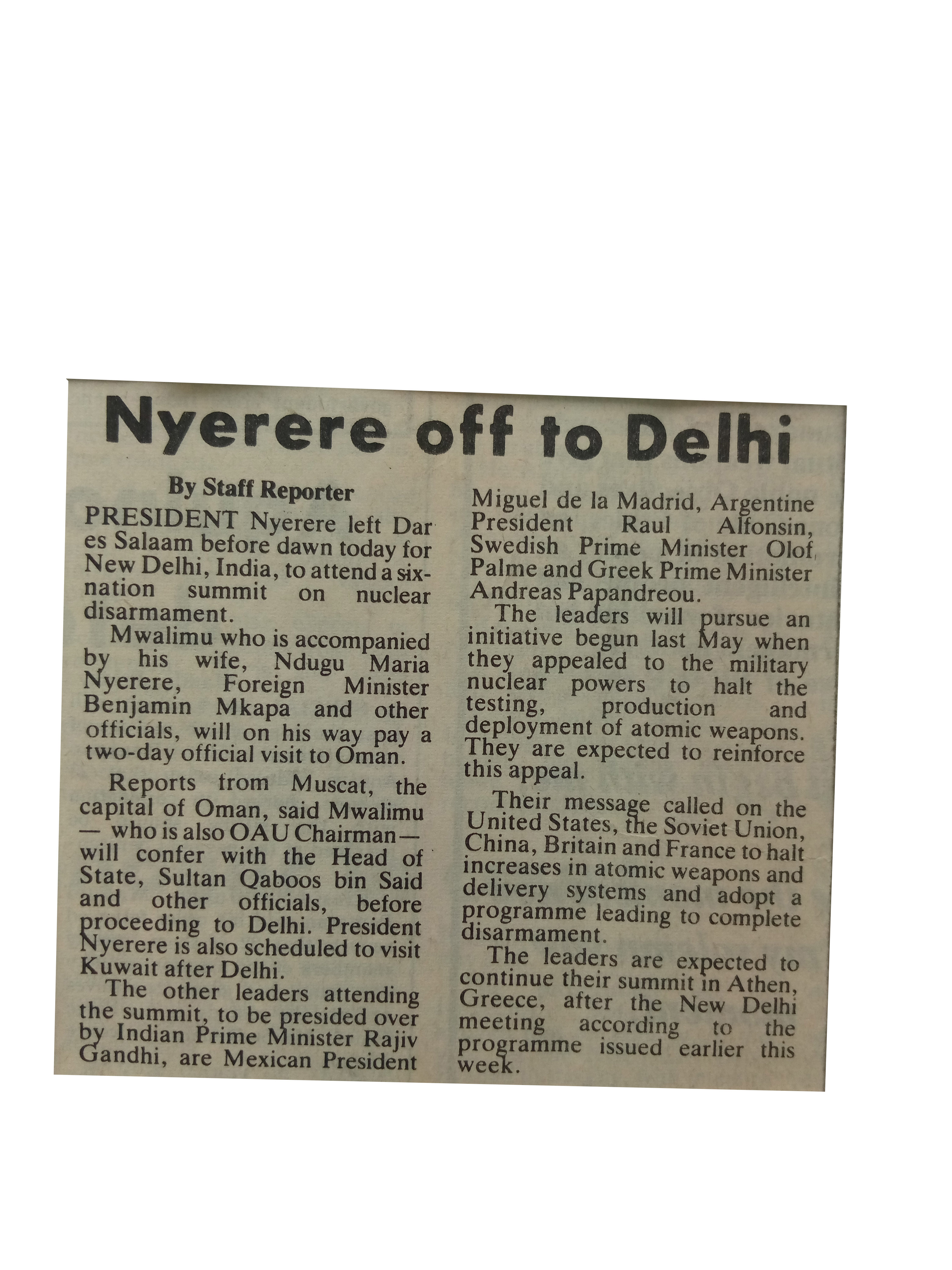President Nyerere left Dar es Salaam before dawn today for New Delhi,India,to attend a six-nation summit on nuclear disarmament. Mwalimu who is accompanied by his wife,Ndugu Maria Nyerere,Foreign Minister benjamin Mkapa and other officials,will on his way pay a two-day official visit t Oman.