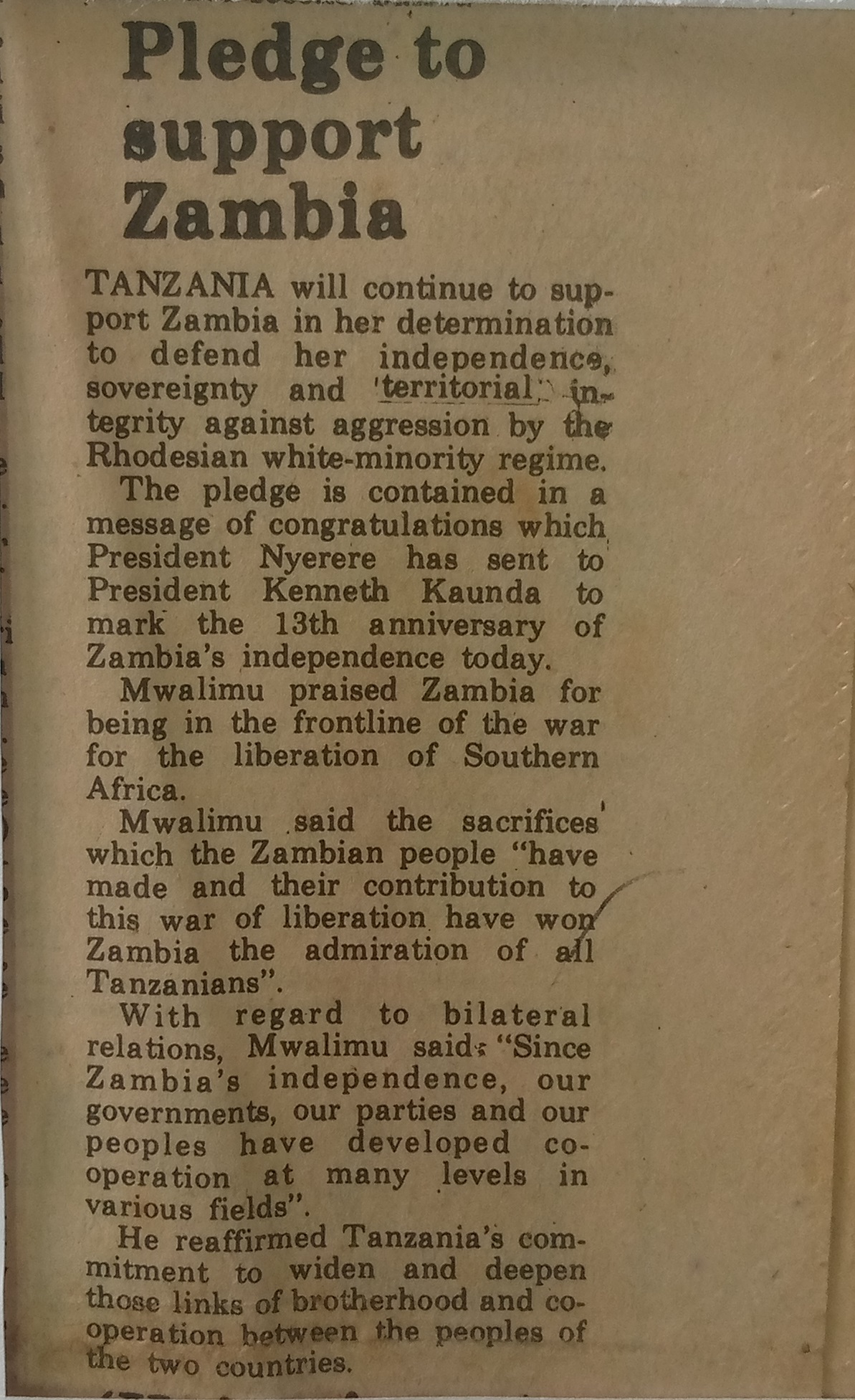 Tanzania will continue to support Zambia in her determination to defend her independence sovereignty and territorial integrity against aggression by the Rhodesian white-minority regime.