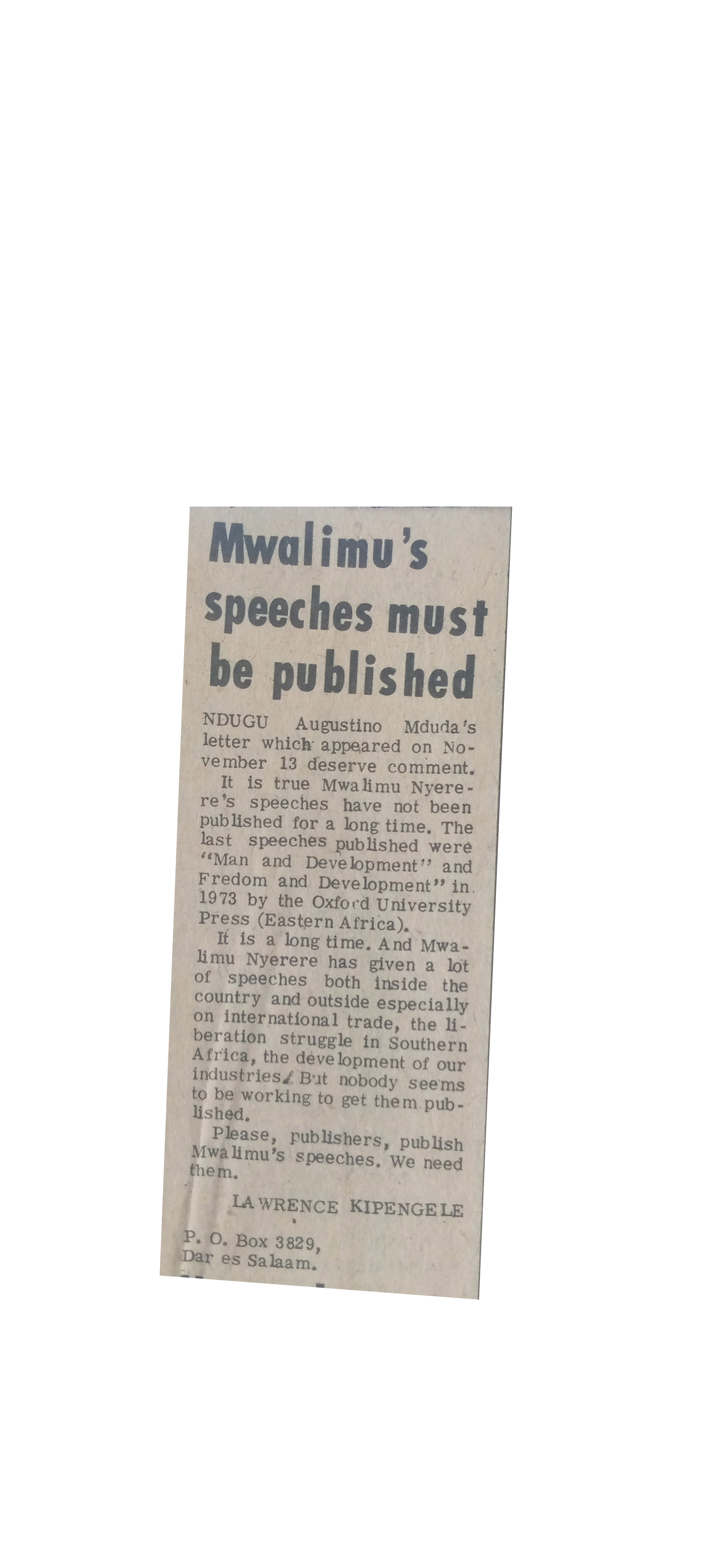 NDUGU Augustino Mduda's letter which appeared on November 13 deserve comment .It is true Mwalimu Nyerere,s speeches have not been published for a long time.The last speeches published were"Man and Development" and freedom and Development" in 1973 by the Oxford University press(Eastern Africa).