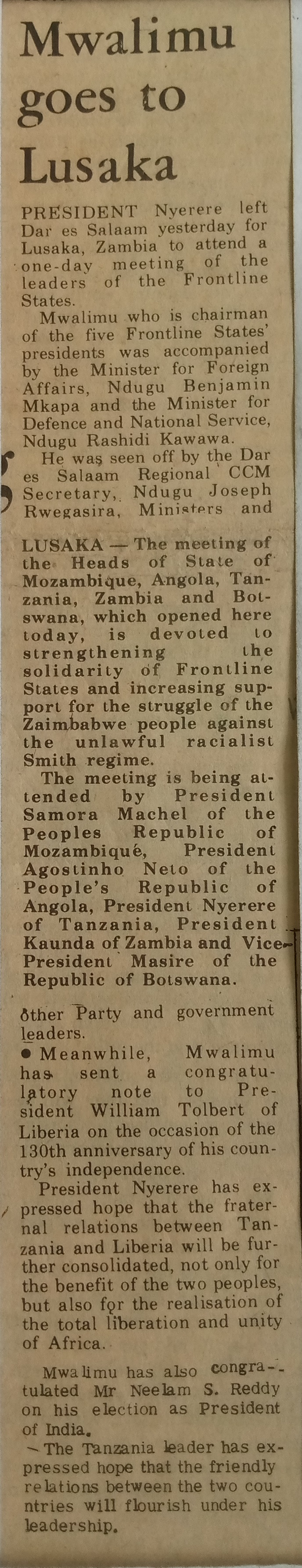 Mwalimu goes to Lusaka (1977, July 26) Daily News,pp.1