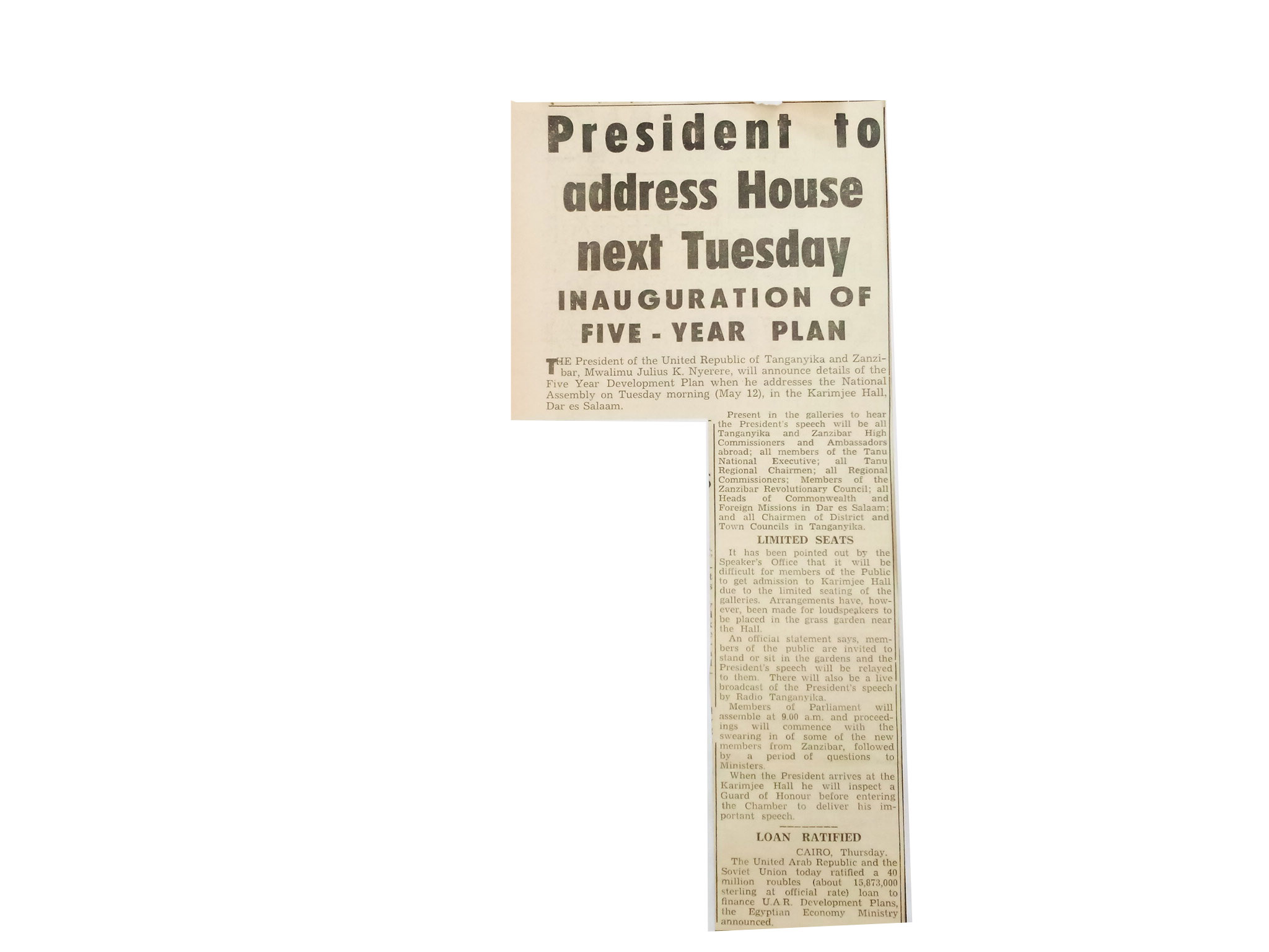The president the United Republic of Tanganyika and Zanzibar Mwalimu will announce details of the five years plan when he addresses the National assembly on 12 May in the Karimjee Hall