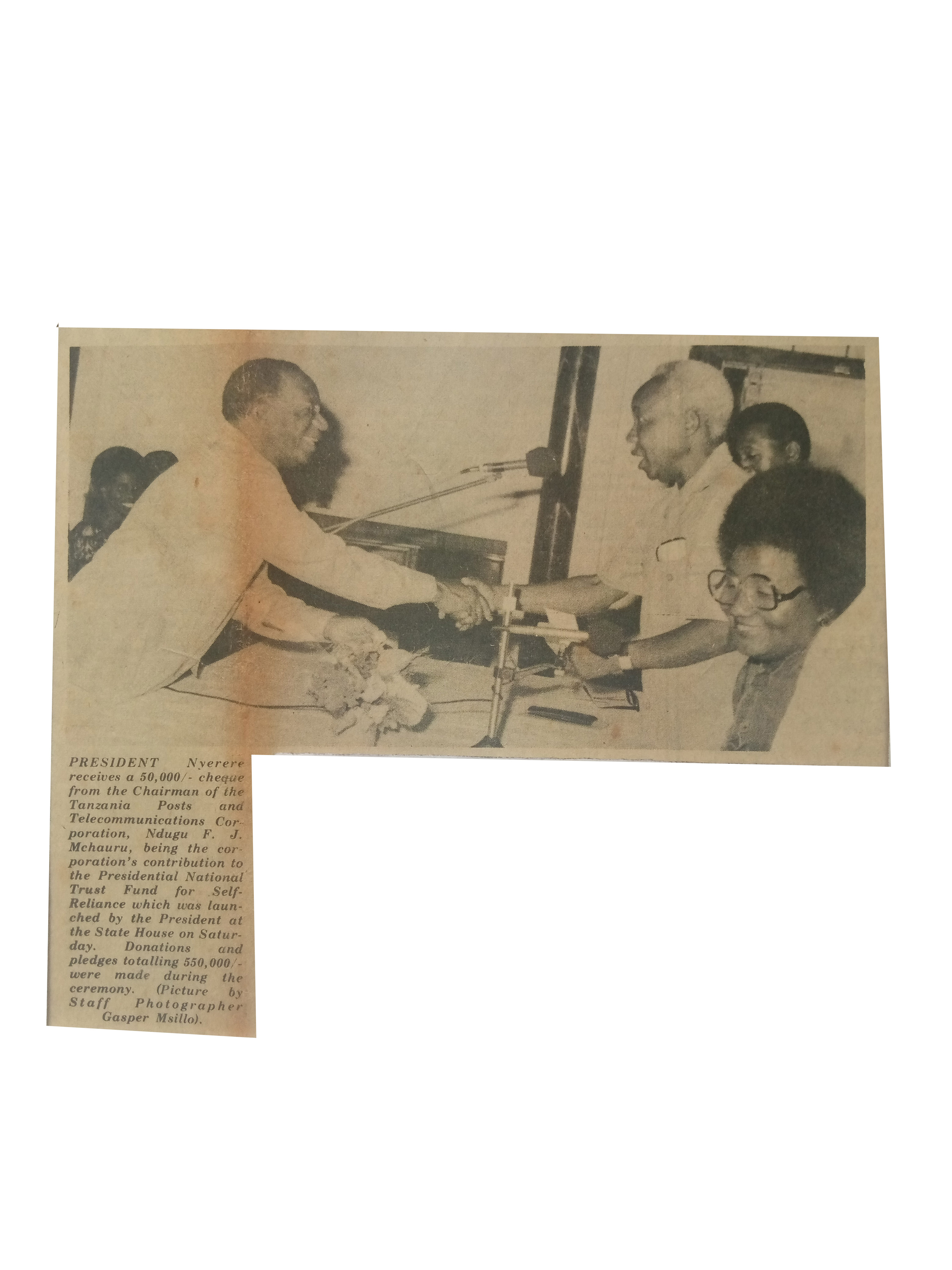President Nyerere receives a 50,000/- cheque from the Chairman of the Tanzania Post and Telecommunication (1985,February 11) Daily News.pp.1