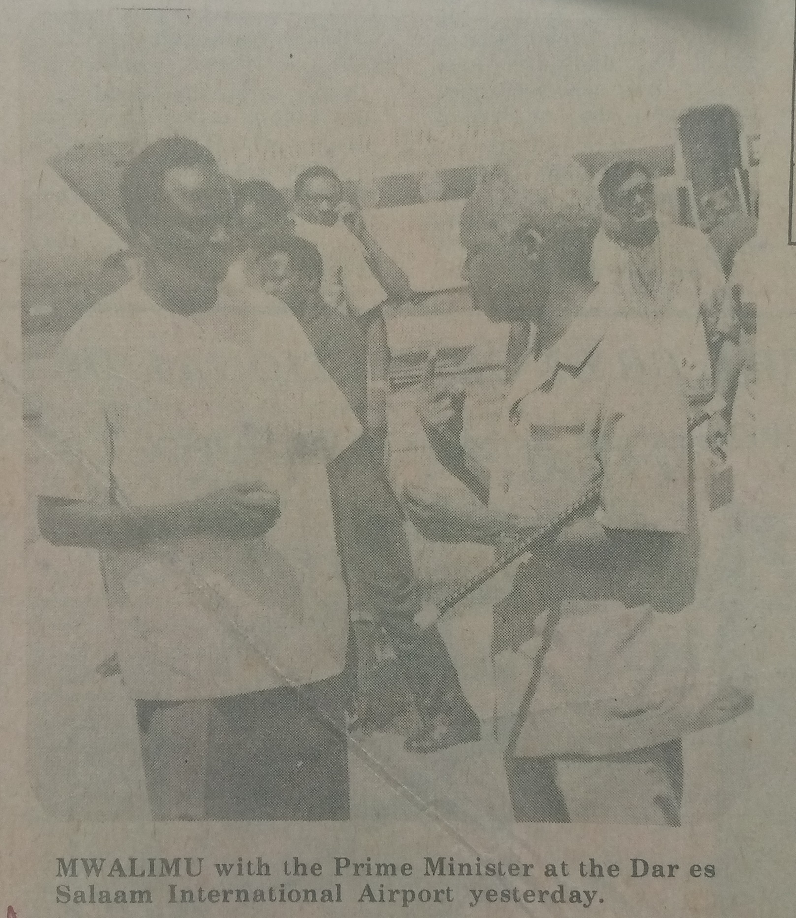 Mwalimu with thw Prime Minister at the Dar es Salaam International Airport yesterday