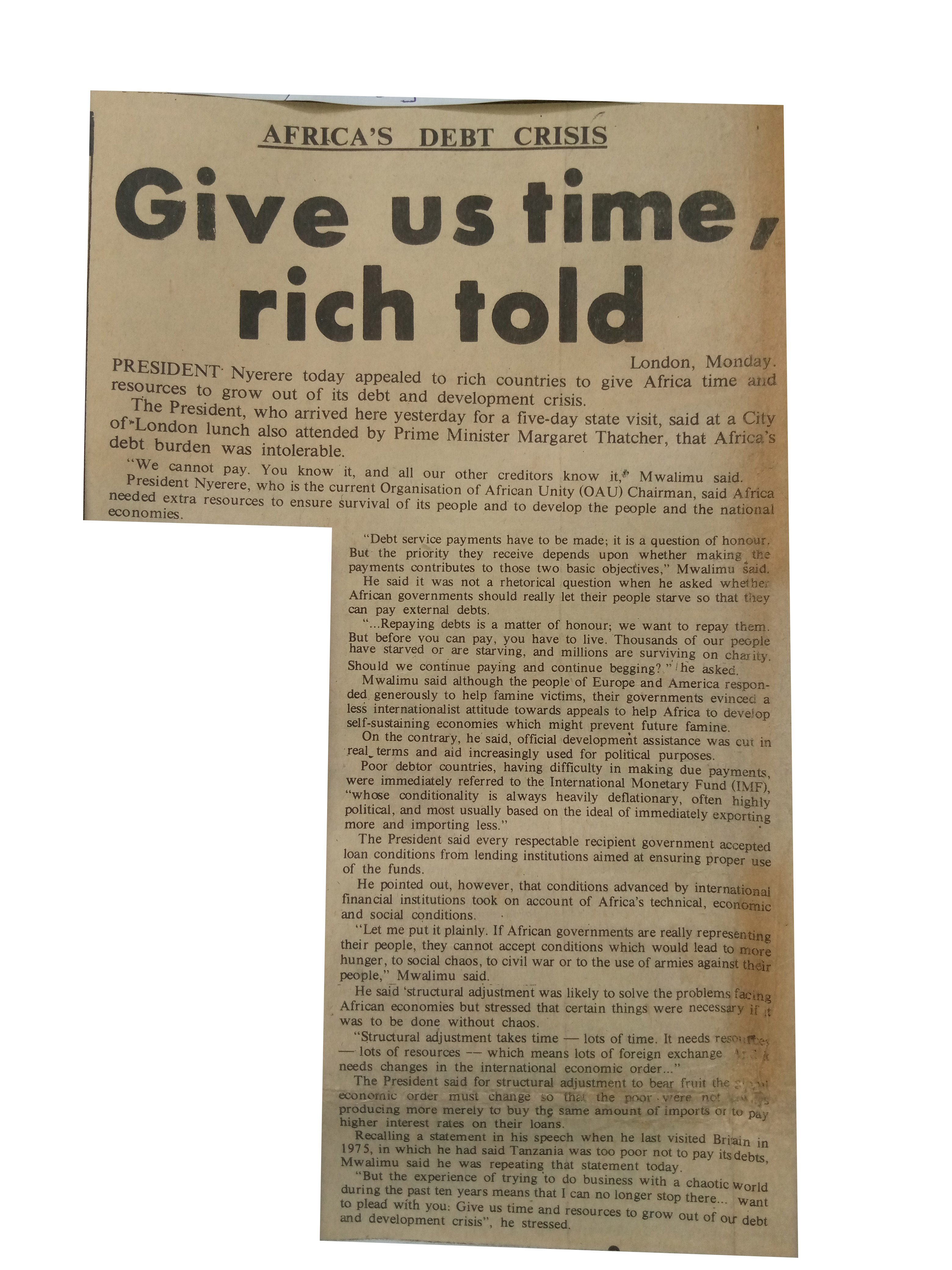 President Nyerere today appealed to rich continue to give Africa time and resources to grow out of its debt and development crisis.