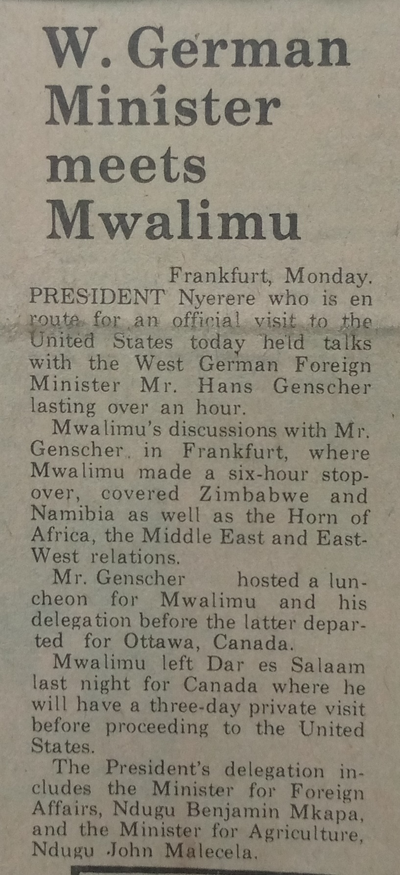 | dc.description.abstract | President Nyerere who is en route for an official visit to the United States today held talks with the West German Mr. Hans Ganscher lasting over an hour. | en_US |