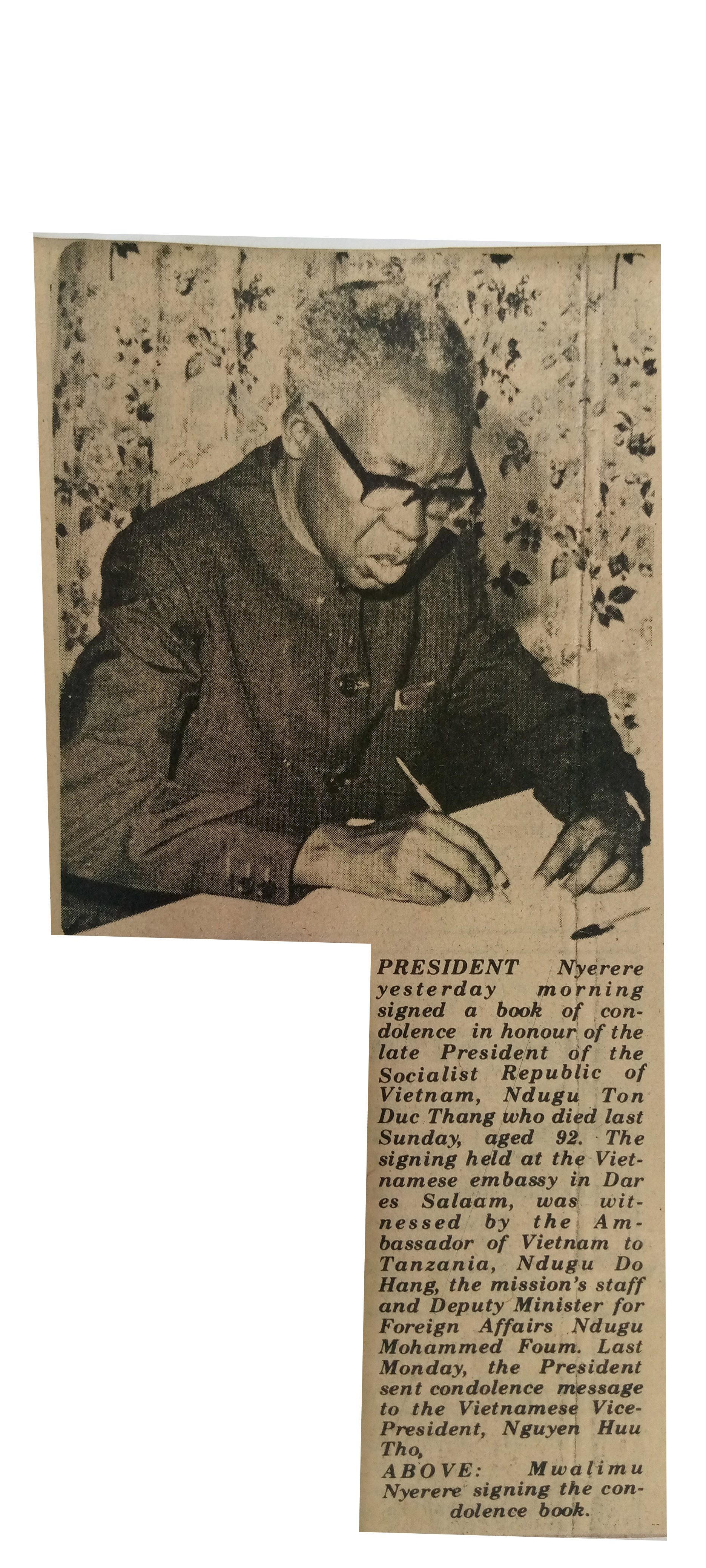 Nyerere, J.K (1980 April 4). President Nyerere signed a book of condolences in the honor of the President Socialist Republic of Vietnam, pp. 3