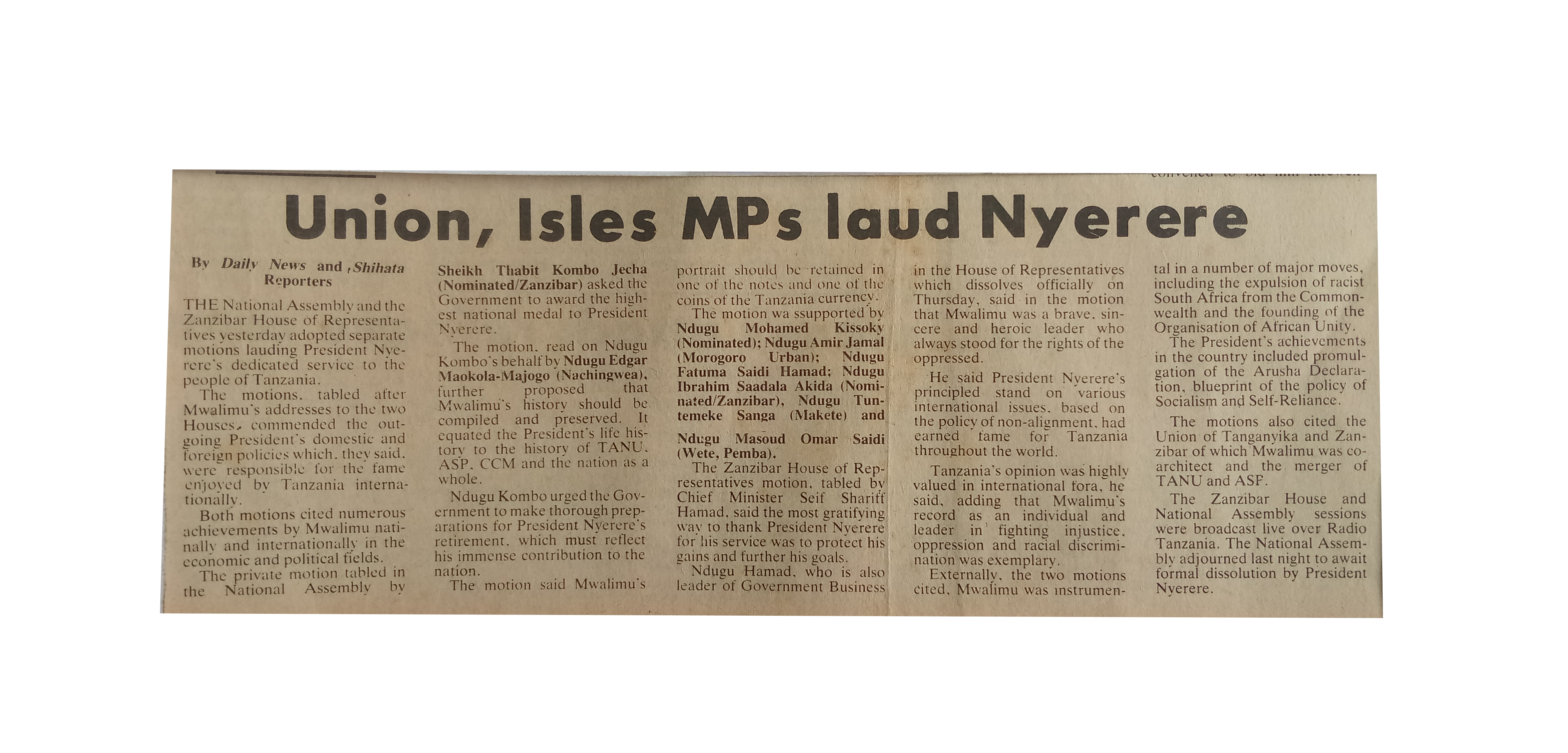 President Nyerere addressing Members of Parliament at the Karimjee Hall in Dar es Salaam (1985,July 30) Daily News,pp1