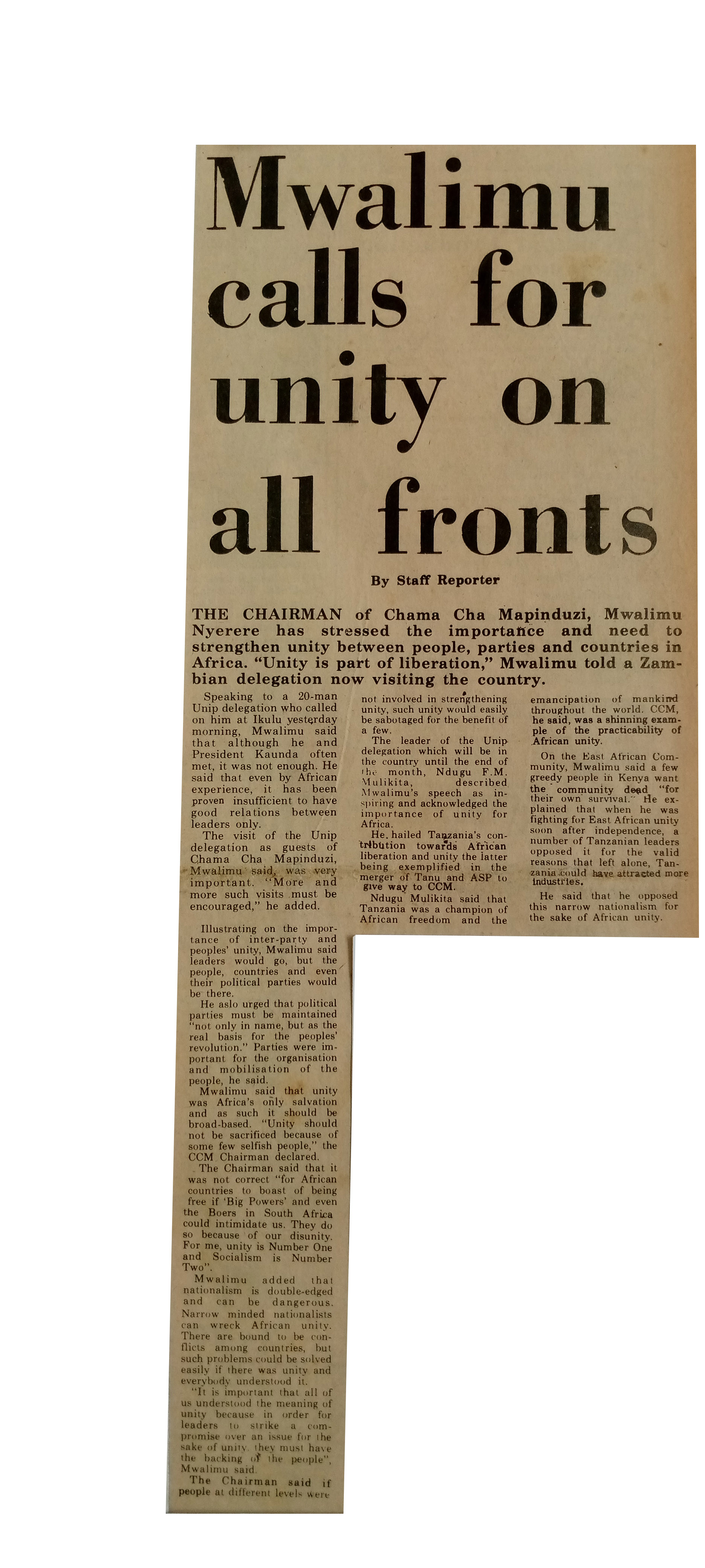 Mwalimu calls for unity on all fronts (1977,July 5) Daily News.pp.1