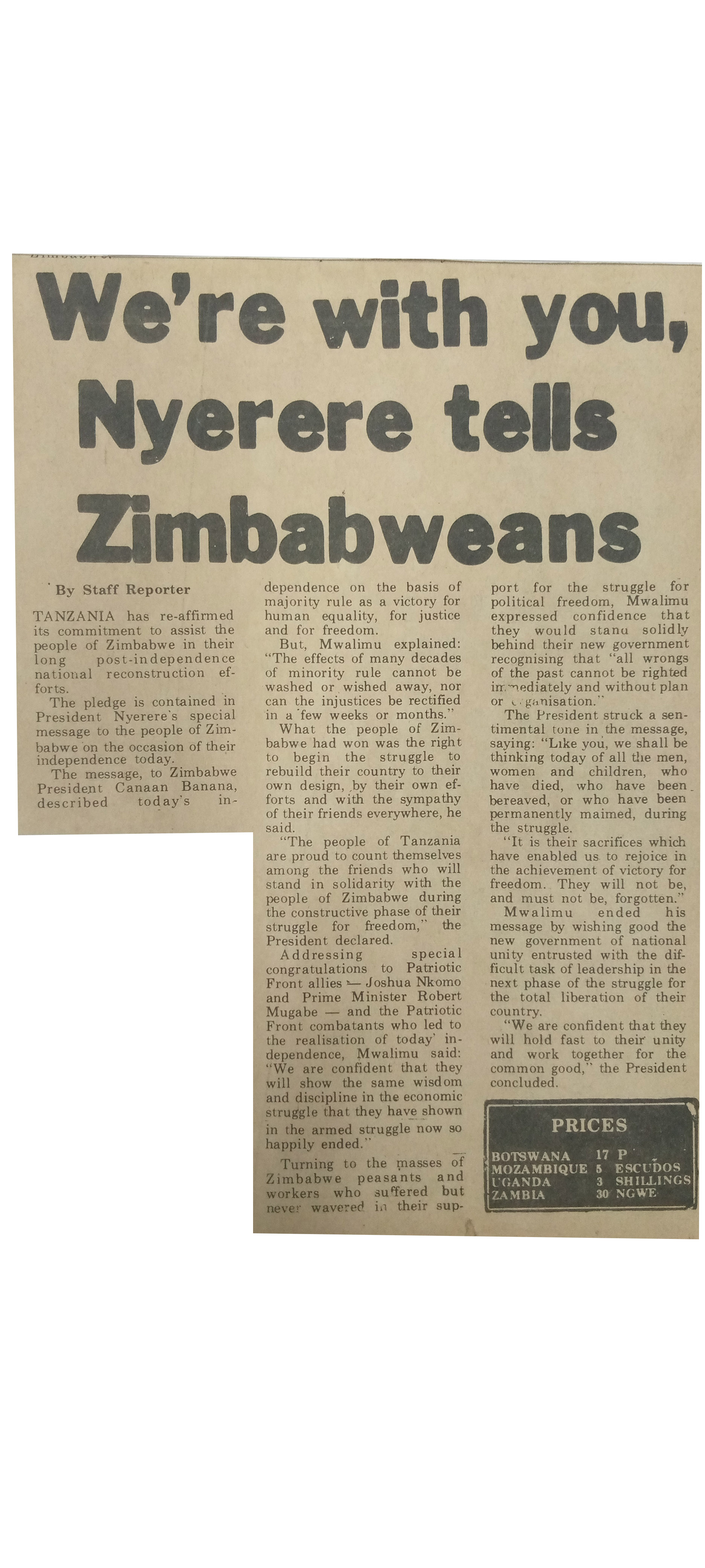 Nyerere, J.K (1980 April 18). We are with you, Nyerere tells Zimbabweans, pp. 1