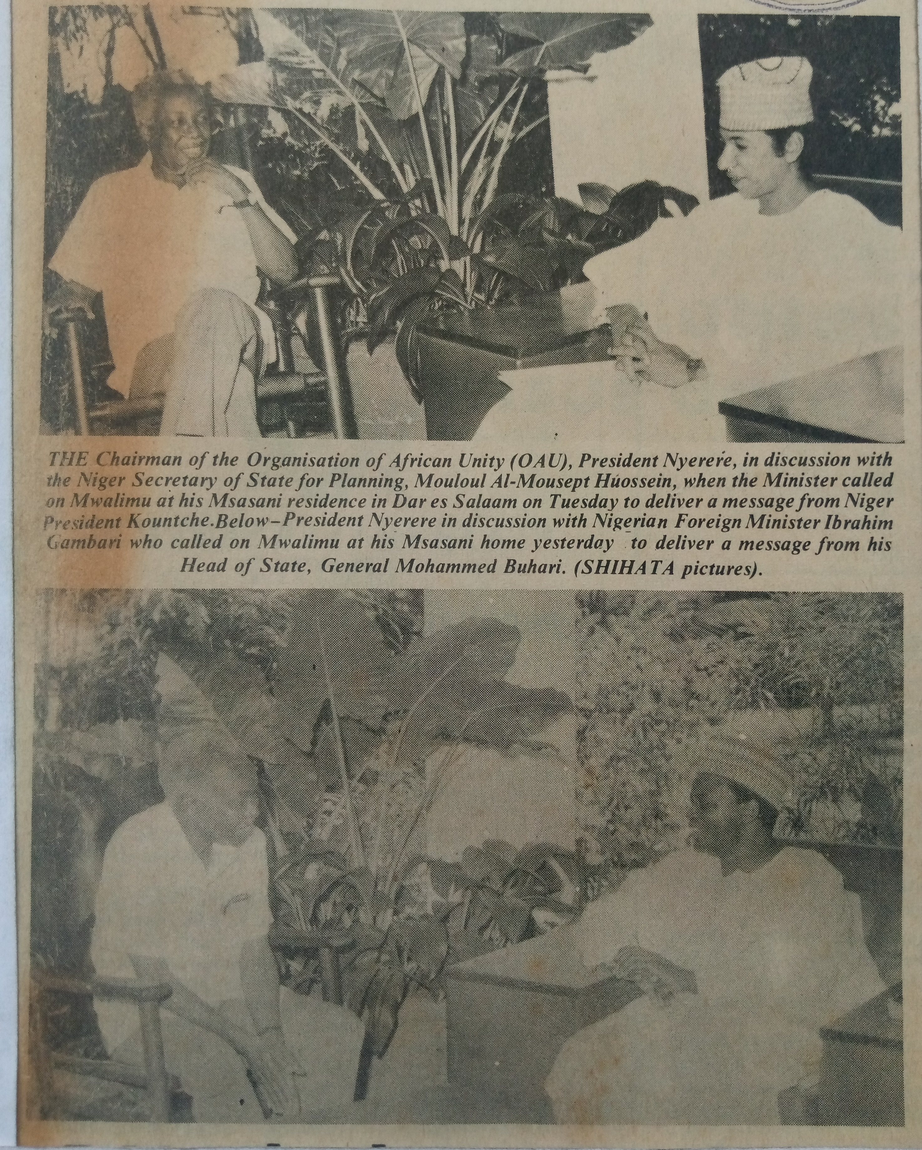 The chairman of the Organization of African Unity (OAU), president Nyerere, in discussion with the Niger secretary of state for planning, Mouloul Al-Mousept Huossein, when the Minister called on Mwalimu at his msasani residence in Dar es Salaam to deliver a message from Niger President Kountche.