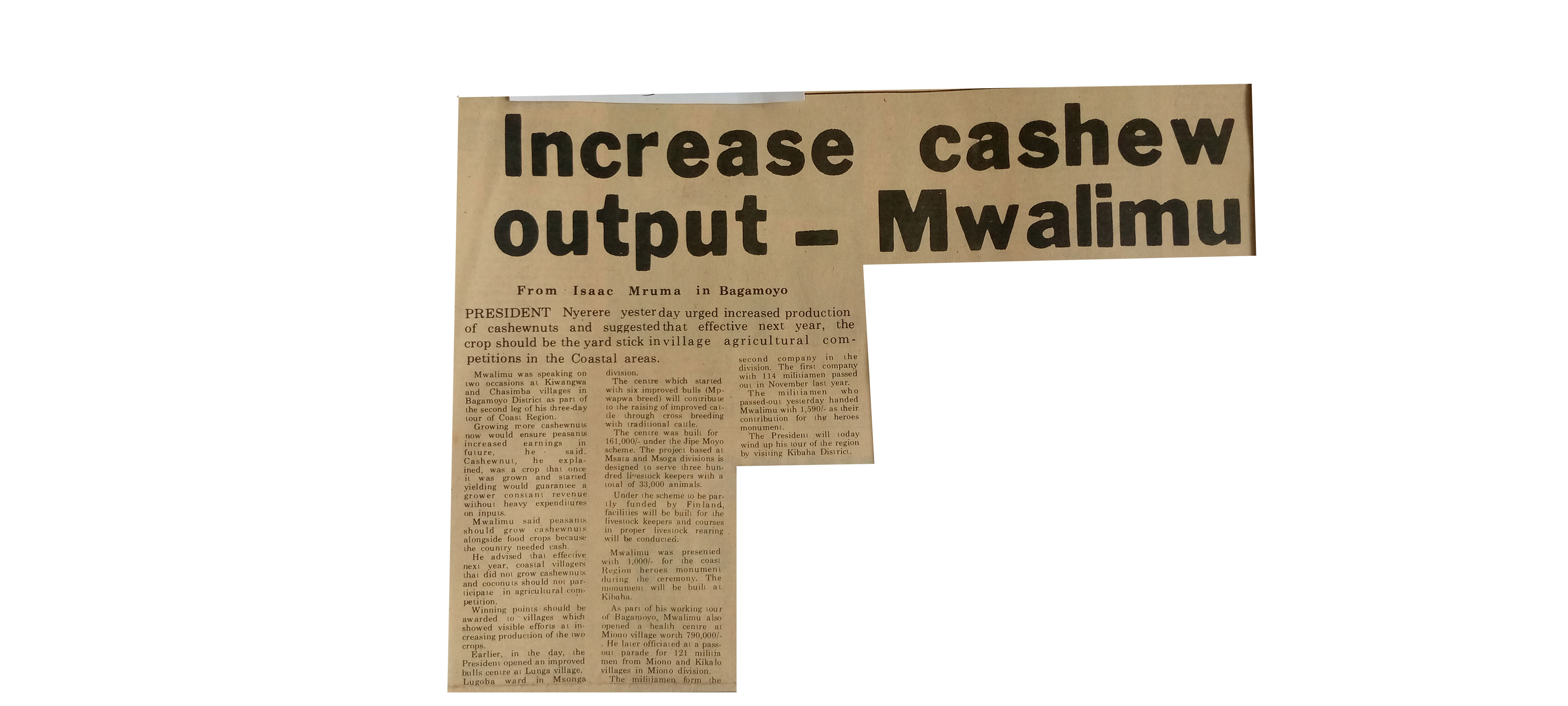 | dc.description.abstract | President Nyerere yesterday urged increased production of cashewnuts and suggested that effective next year,the crop should be the yard stick in village agricultural competitions in the Coastal areas. | en_US |