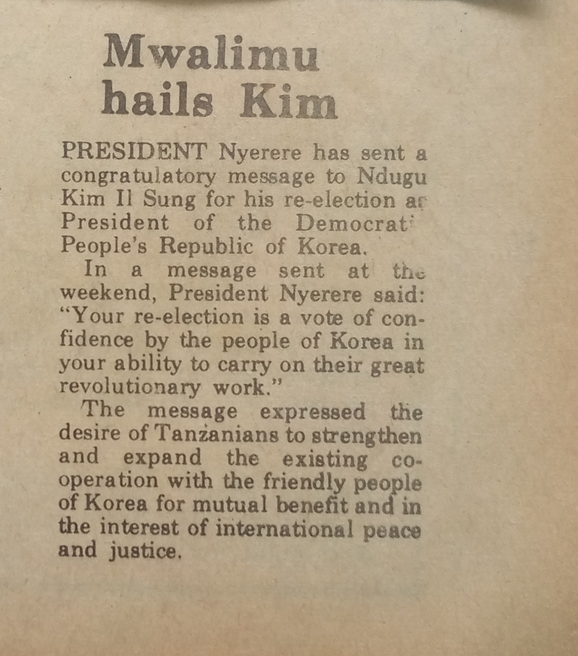 President Nyerere has sent a congratulatory message to Ndugu Kim II Sung for his re-election as President of the Democratic People's Republic of Korea.